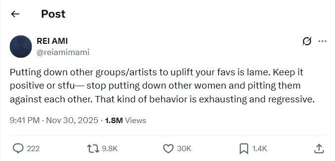 BABY MONSTER 3人高水準的演出,雖然贏來不少讚賞,台下更是熱烈拍掌。但負面批評亦排山倒海而來,尤其Ahyeon的高音表演上,指她的歌聲像雞啼,硬要炫技飆高音,而且在網上引起激烈討論。《Golden》的原唱之一Rei Ami周日就主動發聲,在個人社交平台力撐Ahyeon,「為了抬高喜歡的團體/藝人而貶低別人,真的很差。保持正能量及閉嘴,別再貶低其他女性,也別把她們互相比較、對立彼此。」Rei Ami又稱,在曝露在公眾目光下並不容易,有時甚至很可怕,鼓勵Ahyeon保持正能量。