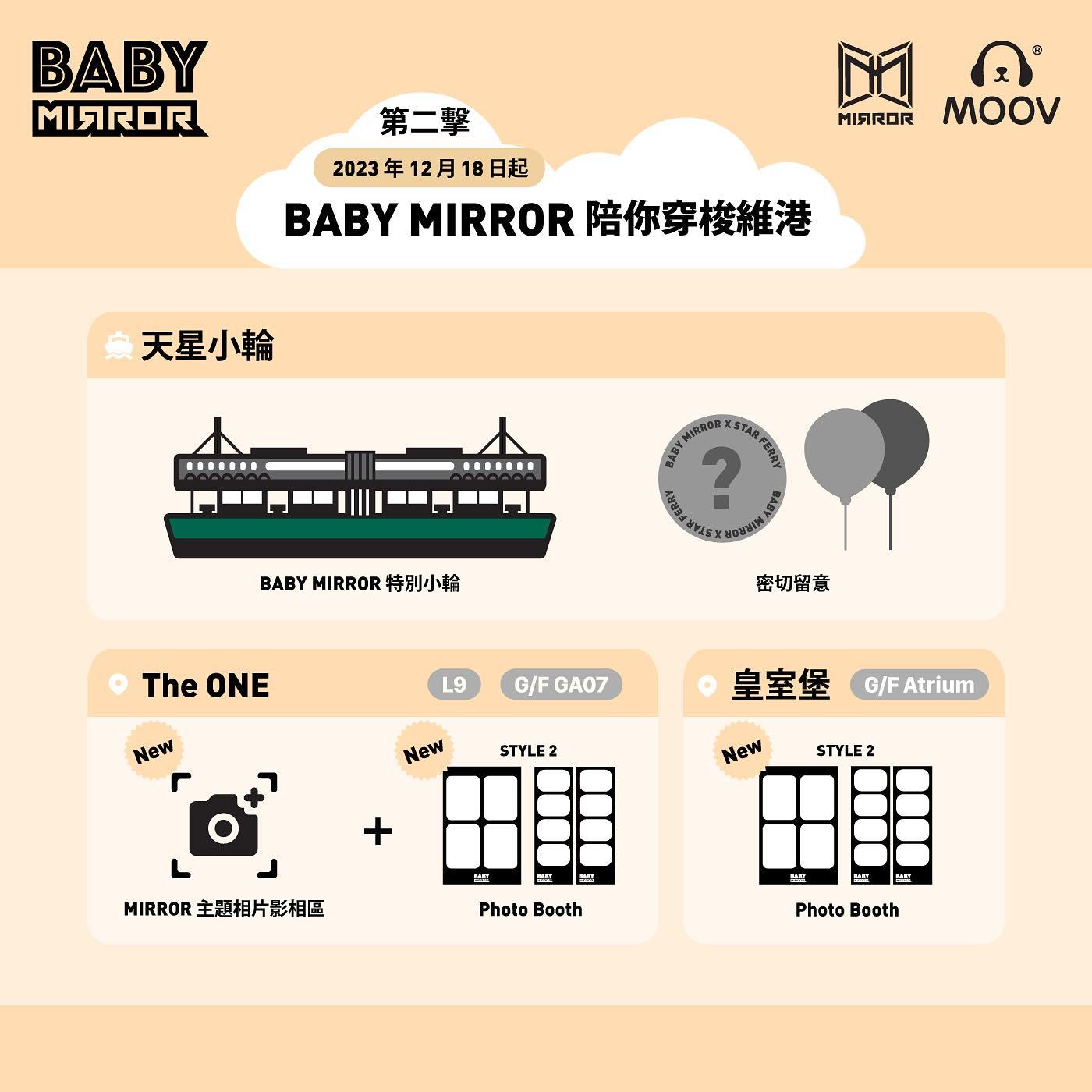 BABY MIRROR 登陸香港最具代表性的交通工具之一天星小輪,橫渡維多利亞港將祝福送給全港市民。三艘橫渡維多利亞港的天星小輪、中環及尖沙咀天星碼頭將設有多個 BABY MIRROR 主題佈置,12 位可愛 BABY MIRROR 將會在碼頭的不同角落中神秘出沒,還有更多驚喜留待大家一一發掘,密切留意更多詳情。