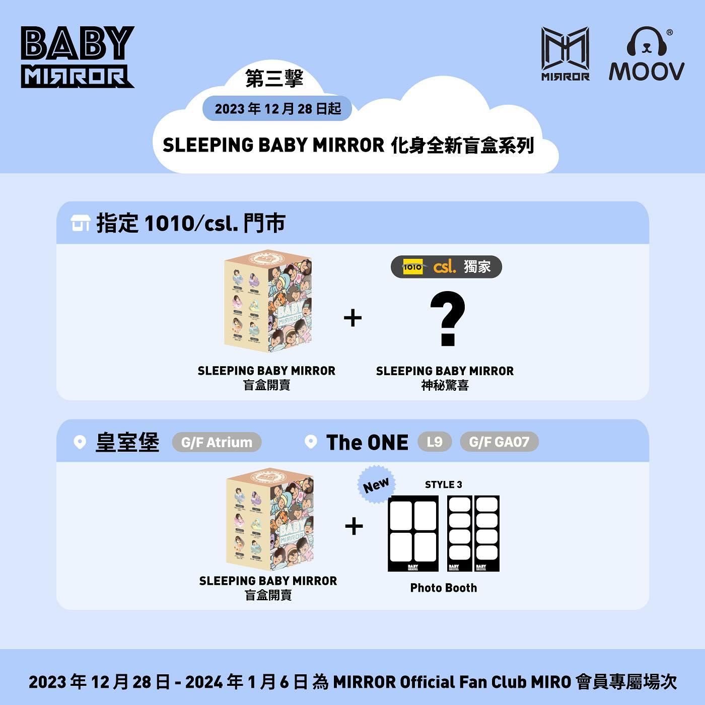 活動期間設置 Photo Booth ,提供 BABY MIRROR 主題相框,購買指定照片套裝即可與 BABY MIRROR 合照,並獲得紀念海報及 3個月 MOOV 16bit 音樂服務禮品卡 BABY MIRROR 特別版。由 12月28 日起亦開始發售一共 12 款全新 SLEEPING BABY MIRROR 盲盒系列。每盒內附1 張基本款小卡或隨機特別版閃卡,另外更有隱藏版 SLEEPING BABY MIRROR。每位SLEEPING BABY MIRROR的睡衣造型,萌爆度極高,當然要逐一收藏,放在房間中讓每晚都能像他們一樣放下壓力Have a Nice Dream 啦!