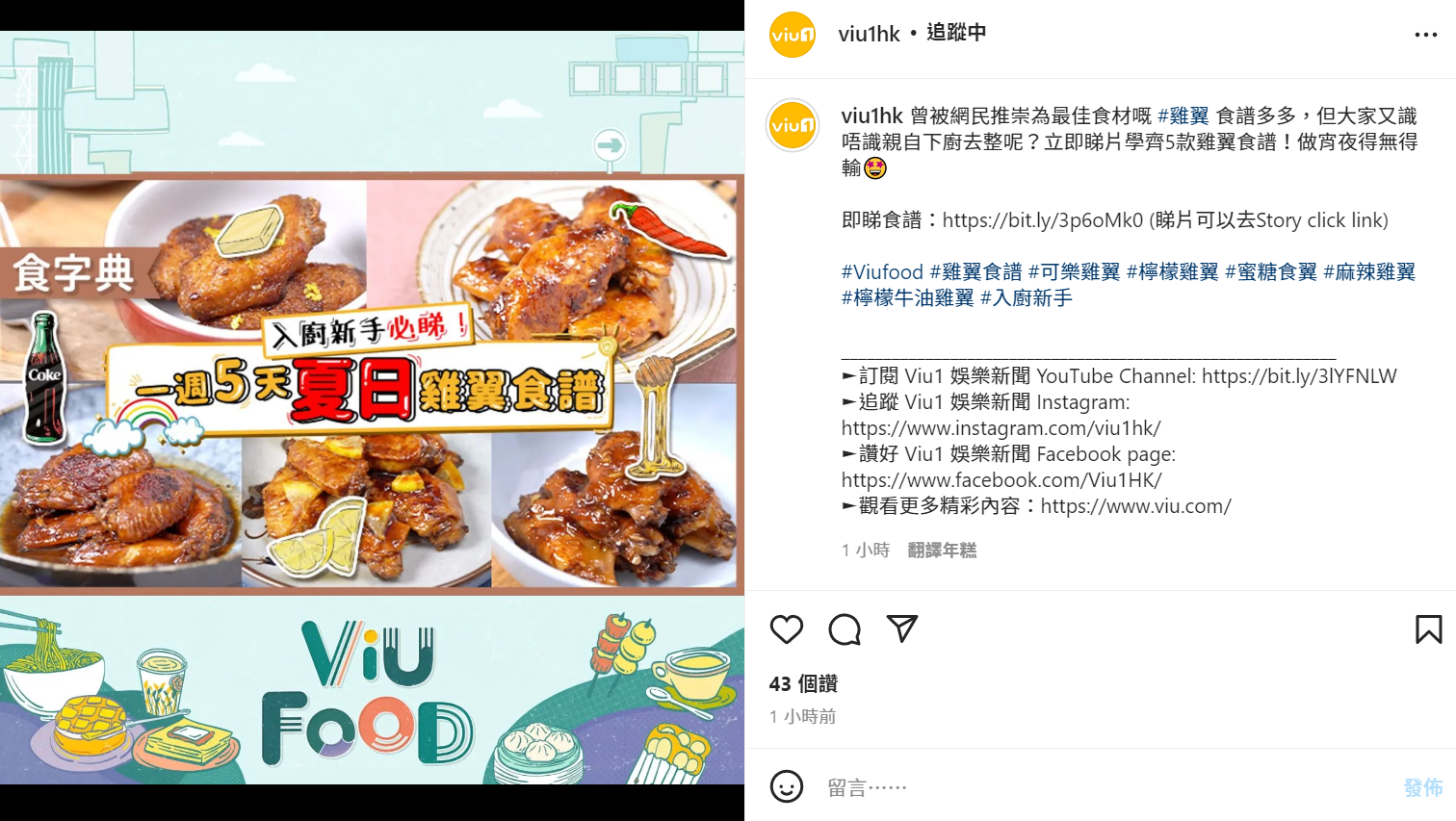 黃Viu的《Viu1 娛樂新聞》IG首個PO便是雞翼食譜。