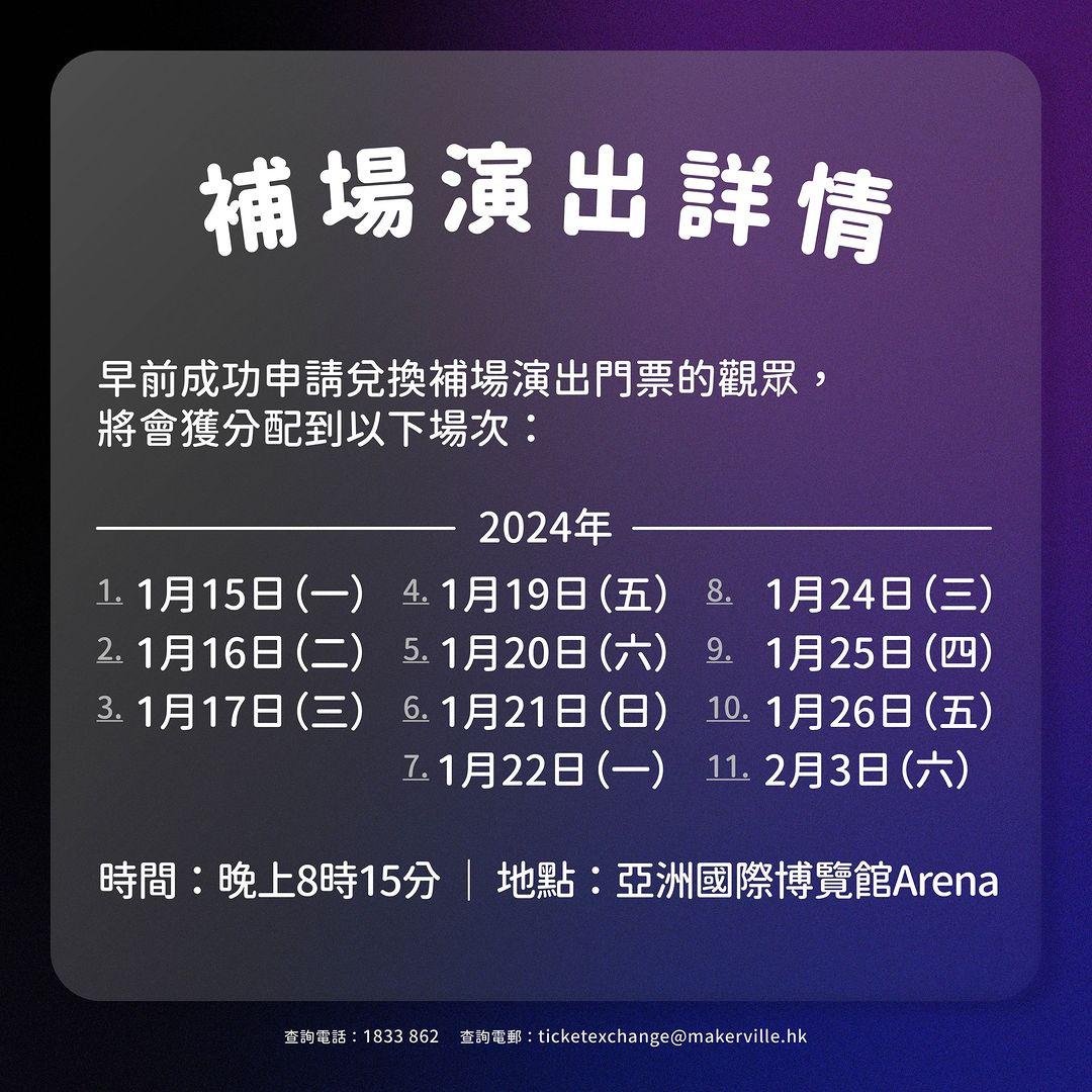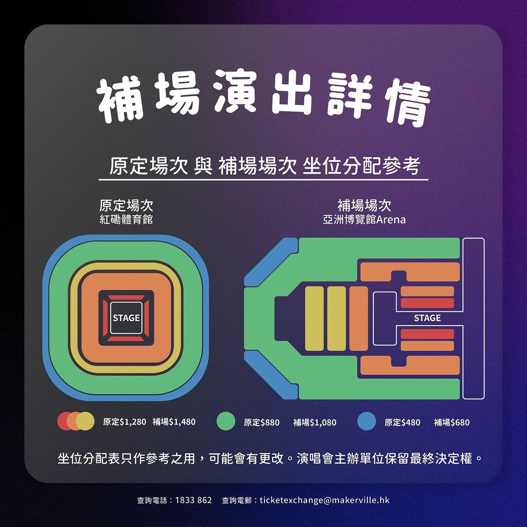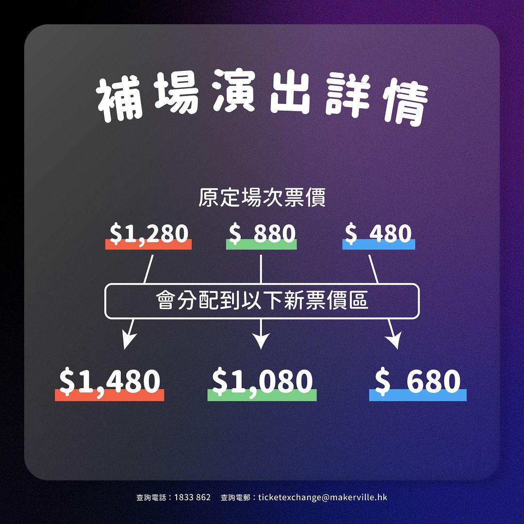 MakerVille今日宣布更多補場兌換門票的資料,詳情如下︰「原定場次票價$1,280門票的持票人士,會分配到補場演出$1,480票區;原定場次票價$880門票的持票人士,會分配到補場演出$1,080票區;原定場次票價$480門票的持票人士,會分配到補場演出$680票區。」
