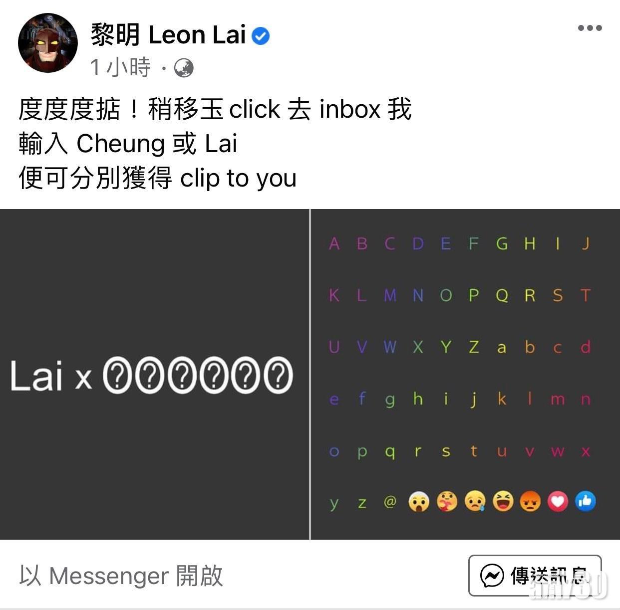 黎明早前在社交平台表示有新搞作,更推出競猜遊戲,留下「Lai X ??????」讓網民猜測,不少人估計是MIRROR或張敬軒(Cheung)。