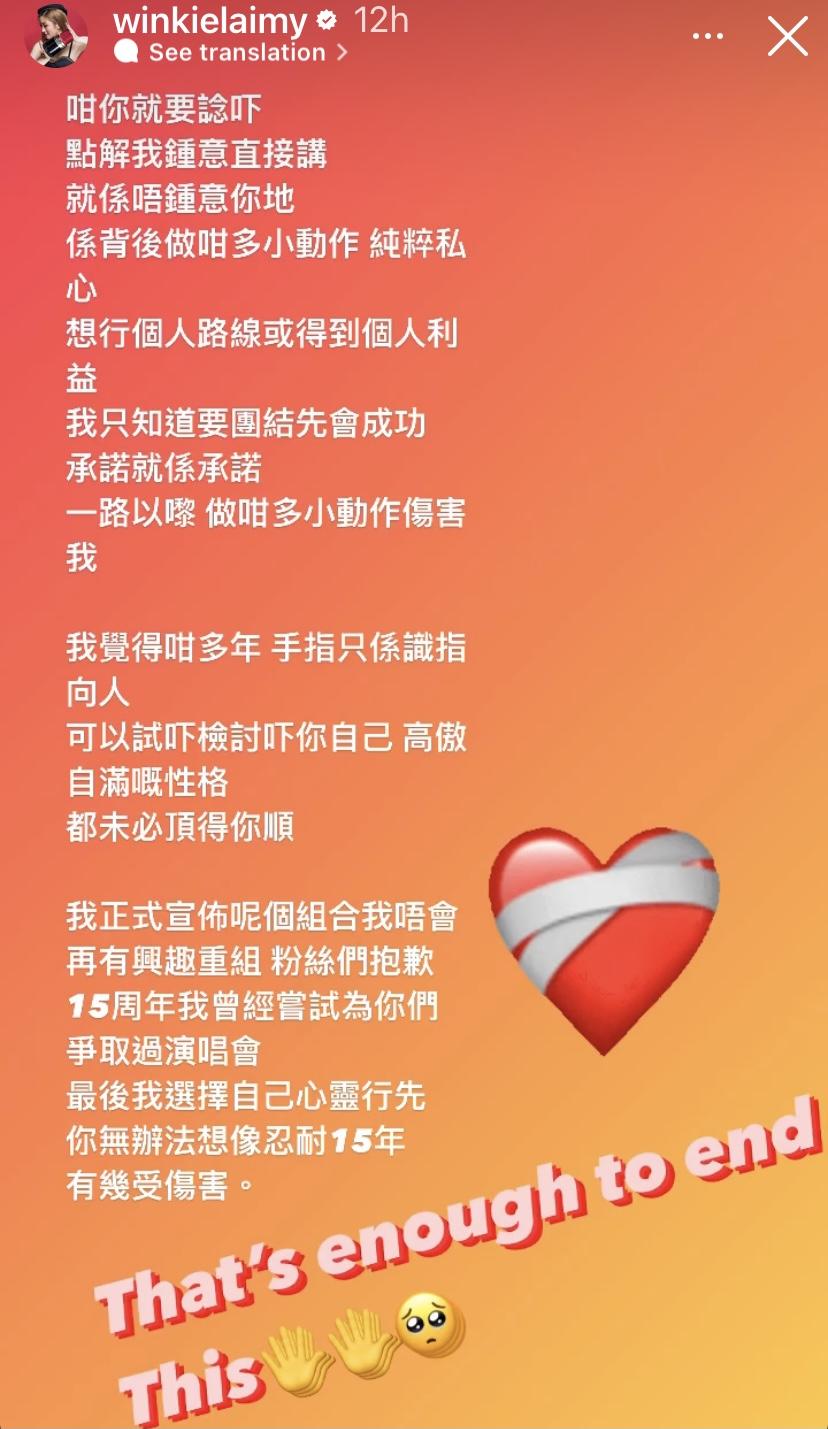 Winkie得知自己被提及後,果然「唔鍾意就直接講」,在IG發文狂轟Regen,認為對方沒必要再提起她,更稱自己也頂不順Regen的性格︰「人前人後一套,無Team Spirit,全為自己私心,唔係我當年追求嘅嘢,我鍾意一齊成功而唔係分開成功,所以係我唔玩。無奈我一直為咗大體,唔想影響大局,隱藏自己感受多年,很痛苦,啞忍15年我現在終於落到決定,我覺得坦誠善良相處,絕對好過被人出賣,希望有一日你哋都能夠懂得檢討自己,不要在人前扮成弱者。關係係雙方不是單向,社會很多人都有情緒病,我亦試過,唔代表我唔出聲!不要用這種手法宣傳自己新歌,I'm serious now. Get out of my life.」