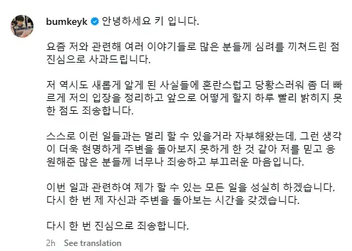 而Key亦有喺社交網站出PO致歉,上載一張全黑嘅圖片,並寫話:「最近因為同我有關嘅各種傳聞,令到好多人擔心,我真係好抱歉。我自己對於新知道嘅事實都感到好混亂同不知所措,所以冇辦法好快咁整理我嘅立場,同埋講清楚今後會點做,呢點我都好對唔住。我一直以為自己可以遠遠避開呢啲事,但係可能就係因為咁嘅想法,令我無好好留意身邊嘅情況,對於一直信任同支持我嘅各位,我真係覺得好抱歉同好慚愧。」
