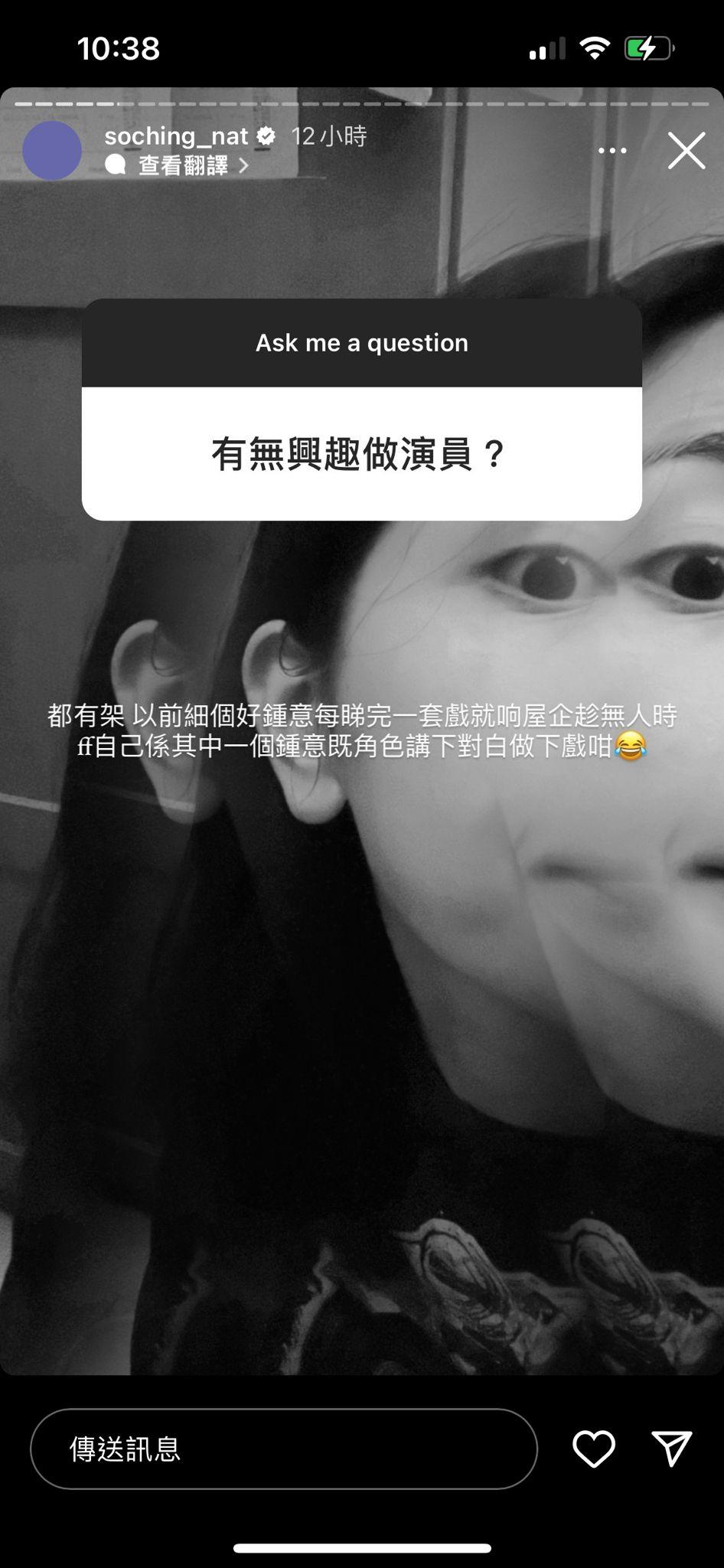 另外,So Ching現在不時都會上載自己唱歌及跳舞的影片,有不少網民留言問她會否作獨立歌手發展,甚至出唱片等等,她表示對這些提問感到受寵若驚,自己也不知道未來會如何,一切順其自然,「依家好好鞭策自己、裝備自己等唔同機會來到自然有得選擇。」