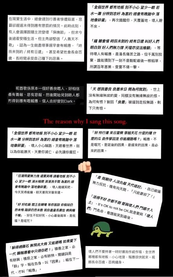 向來敢言的So Ching亦有留意大家討論到她唱《小心地滑》一事,今午在ig限時動態貼上十個網上對《小心地滑》歌詞的解讀,當中有不少提及到因果報應,其中一句解讀更是與壞人鬥長命,看誰笑到最後。她更在這些截圖上用英文寫上「這就是我唱這首歌的原因。」