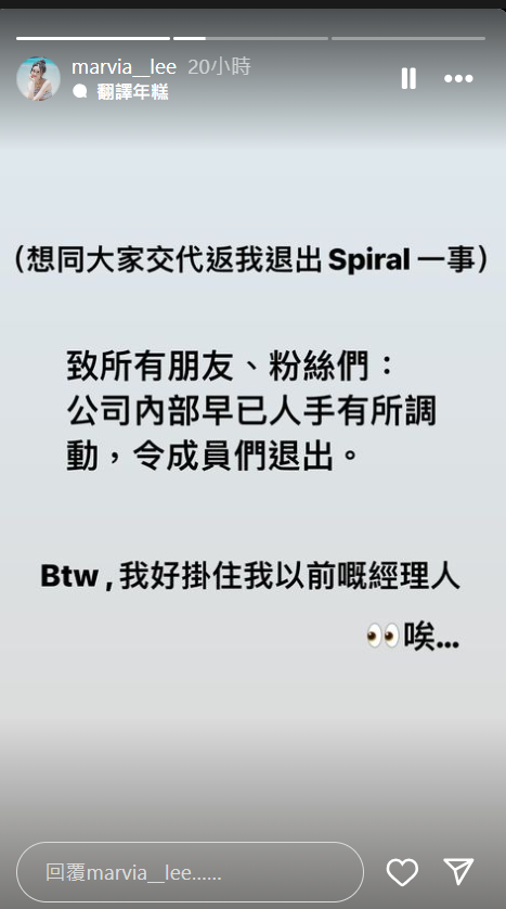 Marvia則於社交平台發文道,暗示公司問題令Spiral「解散」。她說︰「致所有朋友、粉絲們: 公司內部早已人手有所調動,令成員們退出。 Btw,我好掛住我以前嘅經理人 唉」