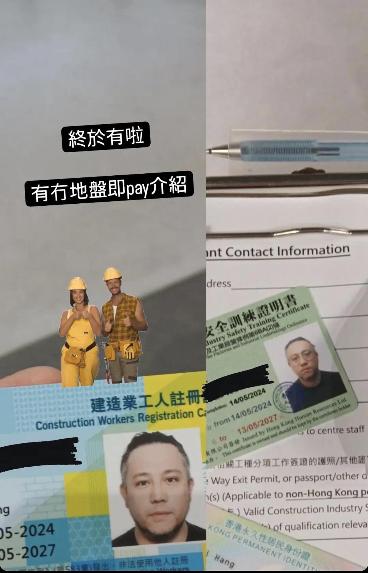 雯雯曾公開埋怨Steven 不肯去報讀建造業強制性基本安全訓練課程(平安卡),但眼見吳浩康憑做地盤殺出一條血路,Steven 早前亦扚起心肝報讀。他今天(8日)在Ig限時動態宣布成功考獲證書,並分享其證明書及建造業工人的註冊證,開心表示︰「終於有啦﹗有冇地盤即pay介紹?」不少網民亦替他高興。