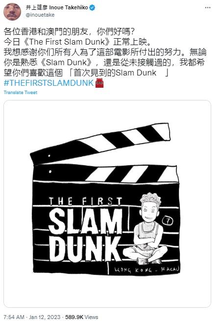 井上老師周四於個人Twitter發帖,希望一眾香港及澳門粉絲會喜歡《The First Slam Dunk》。