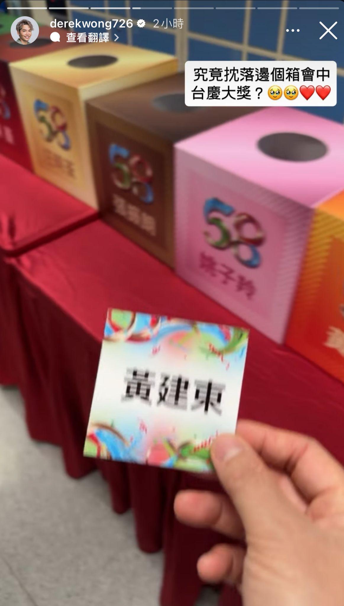 女有份參與演出的黃建東連同《福祿壽訓練學院》一班好友連日為台慶彩排,今日更在IG限時動態分享多則幕後花絮,見到他與吳子沖等人走到一堆抽獎箱前面,每個抽獎箱上都貼出無綫當家小生花旦的名字,正當其他人表示要將自己的名字投到陳豪的箱子時,東東就希望過去曾贏過名車的汪明荃帶挈自己中獎,於是將自己的名字放在汪明荃的箱內
