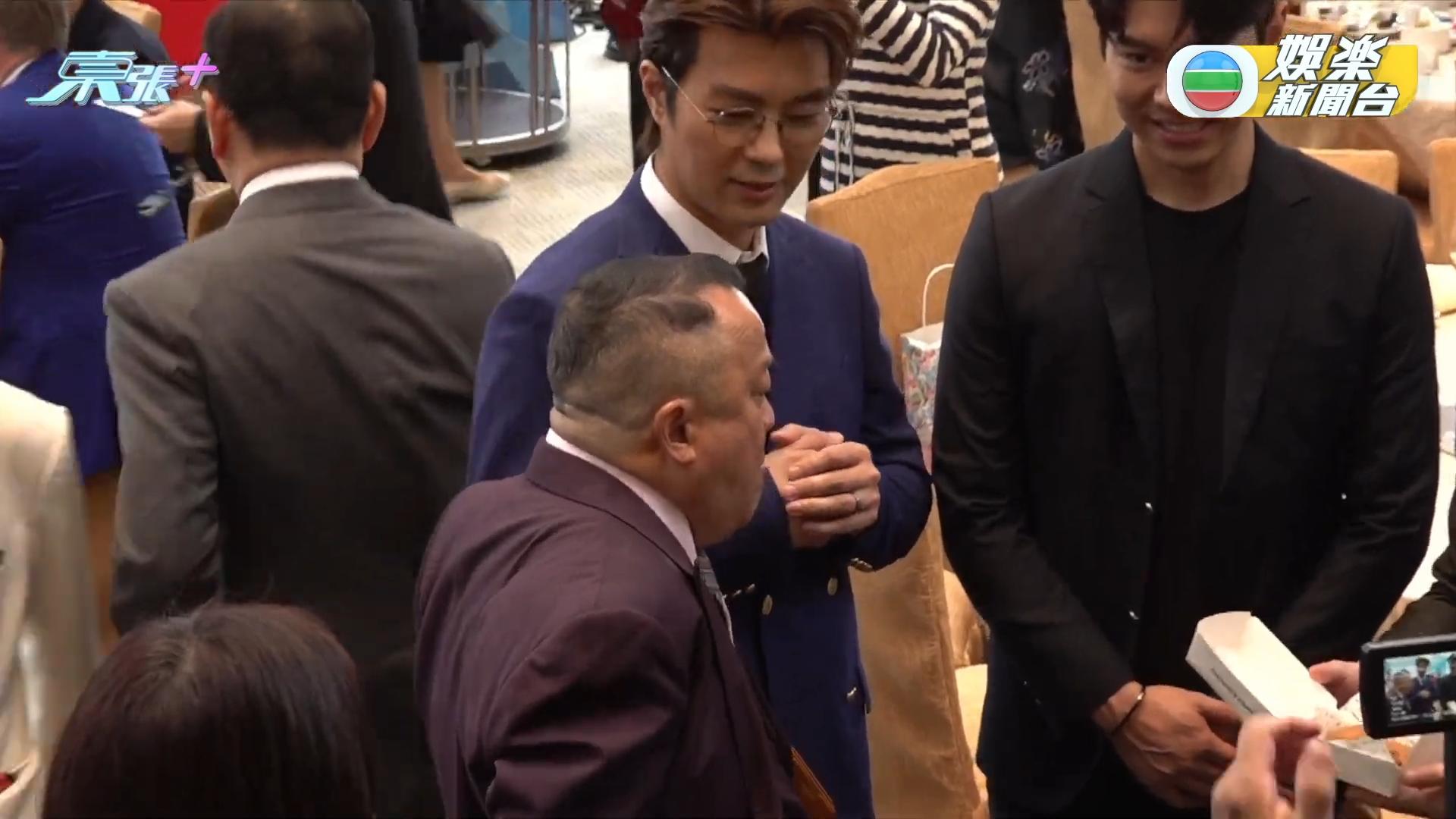 曾志偉在賽事開跑前,拿出手機幫高海寧、陳展鵬下注。(TVB娛樂新聞台直播截圖)