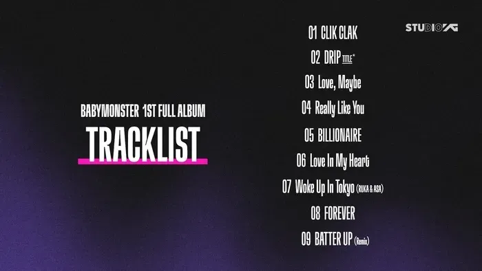 YG娛樂CEO梁賢錫(YG),今日凌晨出片公布旗下女團BABYMONSTER將於下月1日,發布首張正規專輯《DRIP》。此專輯包括共有 9 首曲目,第一首歌《CLIK CLAK》,YG稱:「這是一首YG從未展示過,具備強大原創性的嘻哈歌曲,此曲標誌著BABYMONSTER的新音樂嘗試,所有7名成員都會擔任成說唱歌手。」