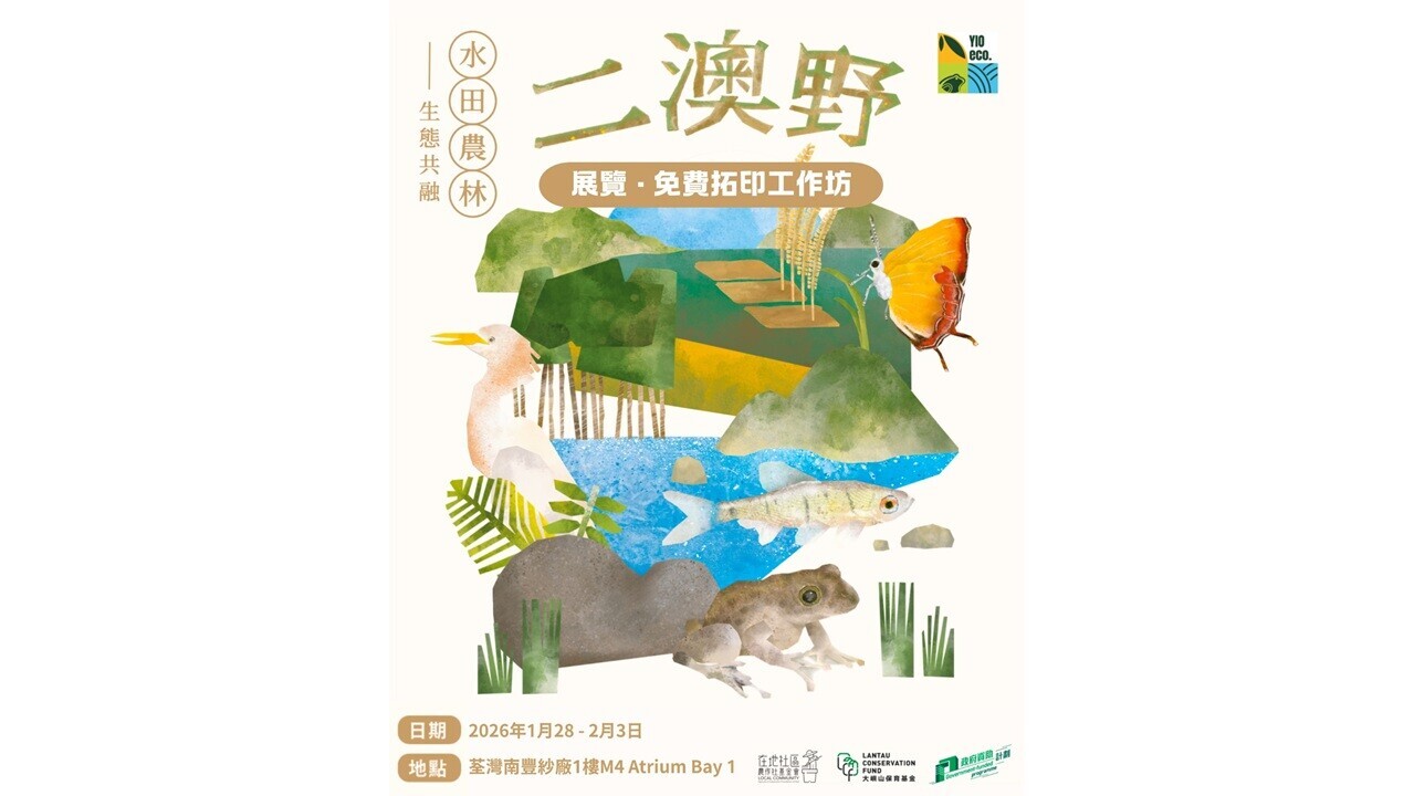 「二澳水、田、農、林 - 生態共融項目」由在地社區農作社基金會推動,獲「大嶼山保育基金」資助,為期三年。項目透過設立永久濕地,協助具保育價值的米魚和線細鯿繼續繁衍,並重新引入於本港絕跡多年的中國浮蛙。項目亦舉辦各項教育活動,讓公眾人士實地考察及參與二澳生態普查和保育工作。基金會現正於荃灣南豐紗廠舉辦「二澳野:水、田、 農、林——生態共融」展覽,展期至2月3日,並設免費DIY工作坊「葉拓印手工咭」,由「總有一種喺左近」團隊帶領,參加者製作獨一無二的拓印作品。工作坊將於1月31日及2月1日舉行,每日名額80個,先到先得。
