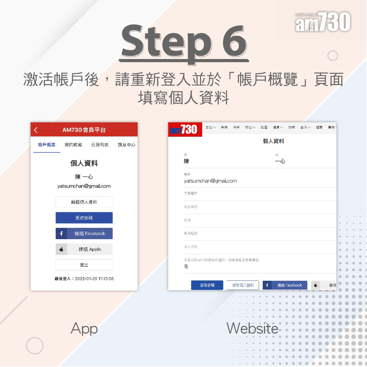 am730會員註冊步驟1 請於圖片顯示位置點擊進入會員頁面。 am730會員註冊步驟2 如果閣下是全新用戶請點擊立即註冊 am730會員註冊步驟3 請按照指示填寫正確資料,並按註冊鍵 am730會員註冊步驟4 請去閣下填寫的登記電郵收件匣依照指示激活會員帳號。 am730會員註冊步驟5 恭喜你完成註冊程序,激活帳戶後去會員專區看看尊享禮遇吧 am730會員註冊步驟6 激活帳戶後請重新登入並於帳戶概覽頁面填寫個人資料。