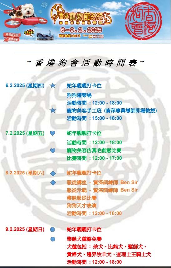 設有蛇年親親打卡位和狗狗遊樂場,並舉行一系列狗狗專屬活動,包括「寵物美容仿真毛創意比賽」及「業餘服從比賽」,更有寵物美容手工班、服從訓練班及狗狗天才 表演等講座和現場演示,亮點之一的「業餘犬種豁免賽」可以一次欣賞到柴犬、比熊犬、鬆師犬、邊界牧羊犬及查理士王騎士犬等參賽狗狗。