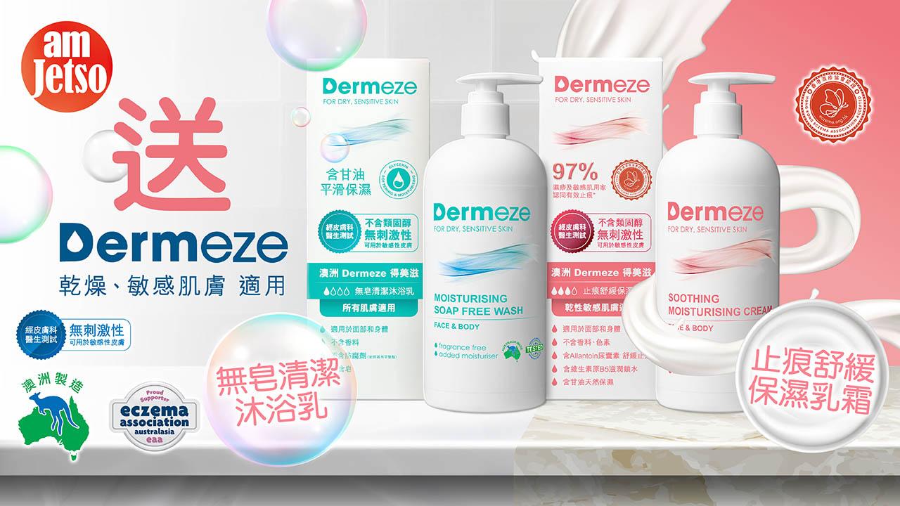 獎品:Dermeze得美滋無皂清潔沐浴乳400ml(零售價$199)及Dermeze得美滋止痕舒緩保濕乳霜 400g(零售價$219)各1支