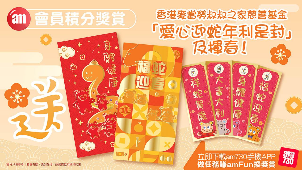 am730會員只要憑amFUN積分即可於am730 APP會員獎賞專區換領「愛心迎蛇年利是封」(一套兩款共40個)及「家Fun熊賀年揮春」(一套四款,非賣品)!