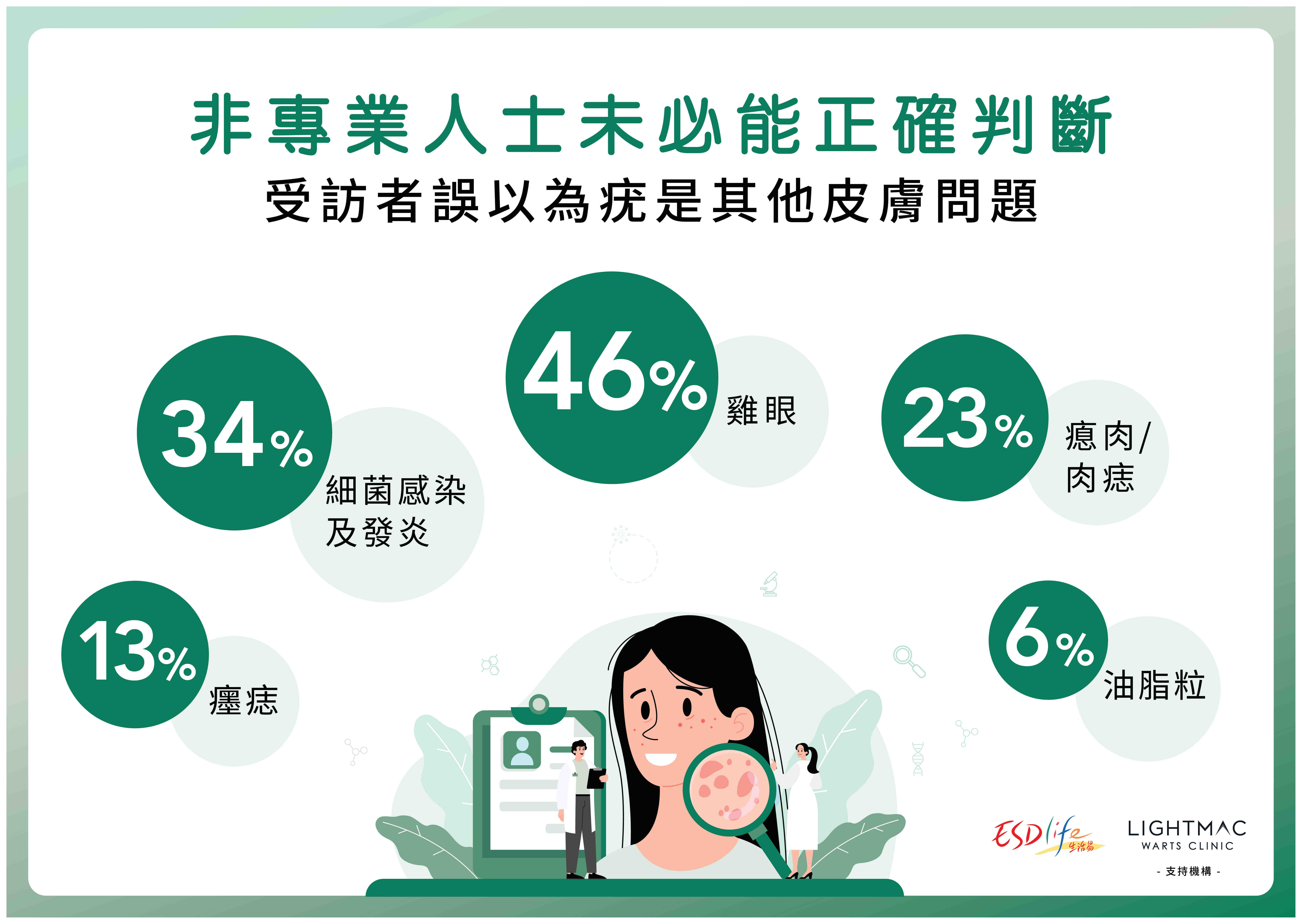 有機構於今年1至2月訪問621人,即使有高達94%受訪者聽過「疣」,惟有33%受訪者不知疣具有傳染性。部分受訪者更誤將疣混淆為其他皮膚問題,如雞眼(46%)、細菌感染及發炎(34%)、瘜肉/肉痣 (23%)、癦痣(13%)、油脂粒(6%)等。疣是由過濾性病毒人類乳頭瘤病毒(HPV)感染而引起,但調查發現58%受訪者不知是由HPV感染引致、37%不知由過濾性病毒引起,更有多達80%人不知道疣屬傳染性皮膚病。