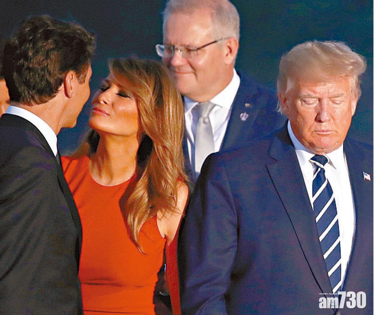 美第一夫人梅拉尼婭(左二)在G7峰會領袖與家眷大合照時,與加拿大總理杜魯多(左一)親面打招呼時一臉冧樣,特朗普剛好合上眼像不滿,此幕在網上引起熱議。