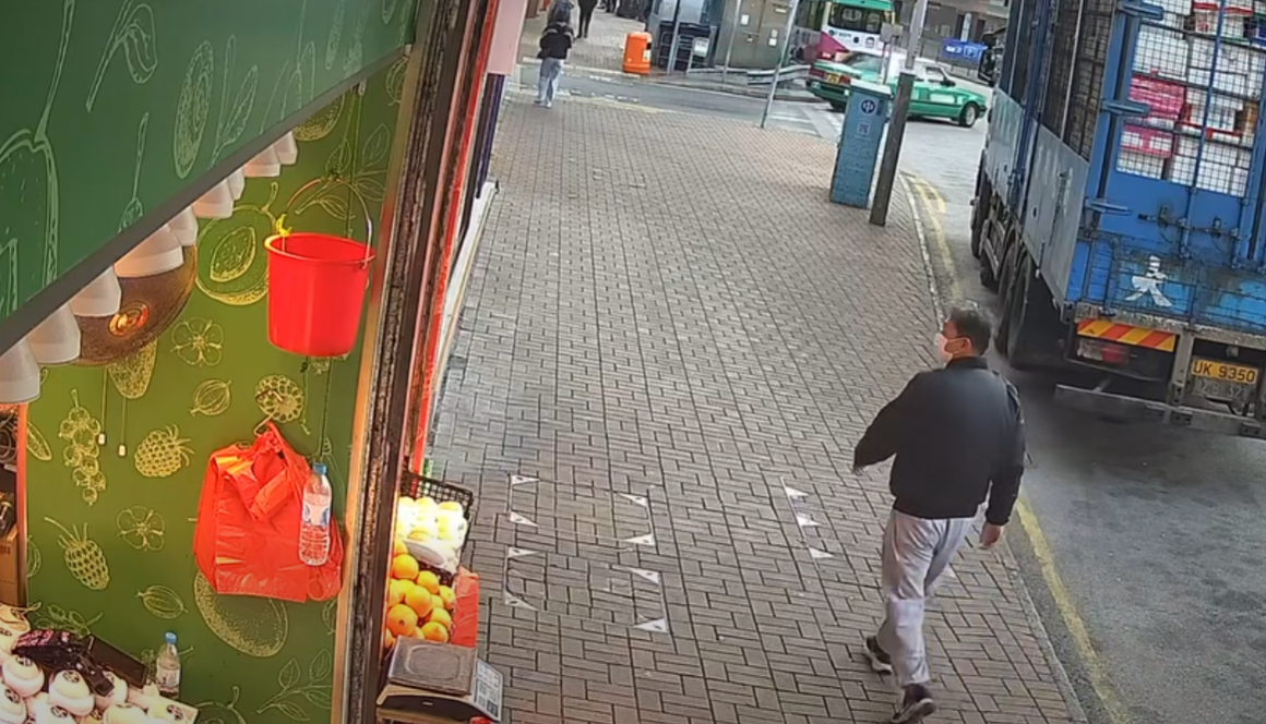 事發於本周日(28日)早上約8時08分。根據店方公開的閉路電視片段可見,一名身穿深色上衣、淺色長褲並戴上口罩的男子,經過生果店門外時不斷觀察,約20秒後當店員轉身入內搬貨之際,口罩男折返步行向生果店,拉下懸掛在門口的紅色膠錢兜,企圖抓走裡面的鈔票,而當時街上有其他路人。然而,生果店早設「機關」防盜,用夾子夾住兜內鈔票,再用繩索將夾子固定在錢兜手柄上。口罩男伸手一抓發現鈔票被繩索絆住,無法取走。此時,店員發現異樣,賊人見狀隨即棄手慌忙逃離。