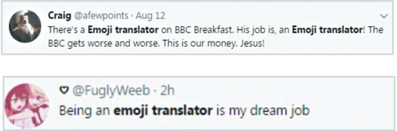 Google Translate等人工智能程式興起,令人擔心翻譯人員會被搶飯碗,但隨著emoji大行其道,翻譯界已出現前所未見的新工種。英國廣播公司(BBC)日前所邀的一位嘉賓,名銜竟是——Emoji翻譯員,引發網民酸民群起挖苦。