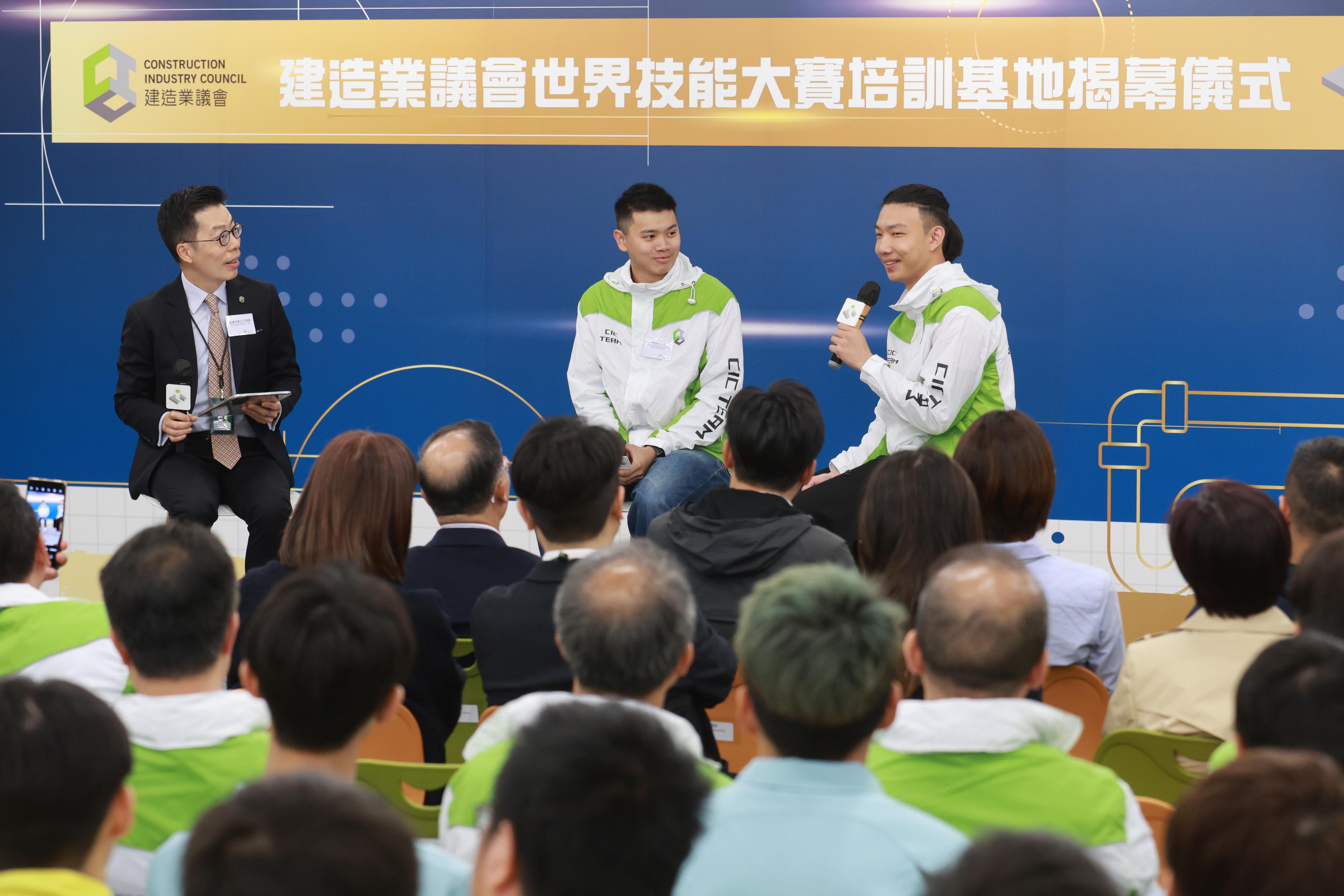 議會特別請來香港建造學院助理院長(培訓)温漢池博士工程師,與2024年世界技能大賽兩位參賽選手對談,參加管道及製暖項目的陳晉廷(Ivan)指,參賽時會遇到一些很獨特的物料,供暖系統也是香港選手甚少接觸的項目,遇到問題便要靠即時應變調整策略,務求減少所受影響爭取最好成績。參加油漆及裝飾項目的吳雲帆(阿帆)則難忘到內地集訓,與當地一位女學員比試畫正方形時他連輸10次,深感天外有天,為了取勝他練習到凌晨2時,再比試時終取得勝利。揭幕禮並舉行了2024年選手及2026年參賽學生傳承儀式,兩位選手更即場為建造業新星解惑,有學員問比賽感到壓力時如何保持冷靜,阿帆指除了個人應變能力外,最重要是完全相信和服從師傅的指示。亦有學員問在比賽中遇到特殊情況如何減少影響?Ivan建議可配帶耳塞參賽,在賽事前盡量預先想出所有可能出現的突發情況和解決方案,就算出現突發情況也可從容面對。