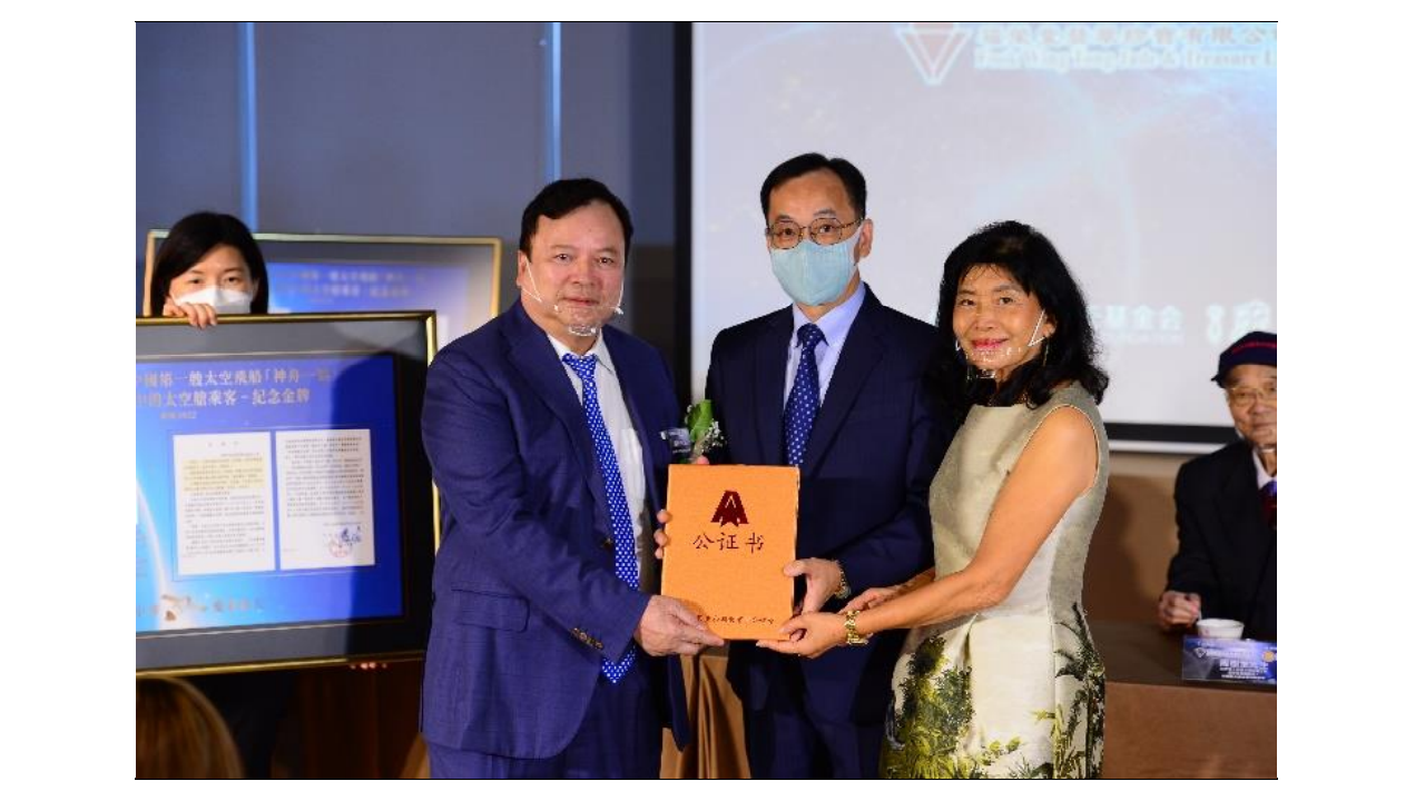 世界華人協會常務副會長何昭先生和慈善家趙曾學韞 BBS太平紳士頒授紀念金牌予「中國航天事業推廣大使」。