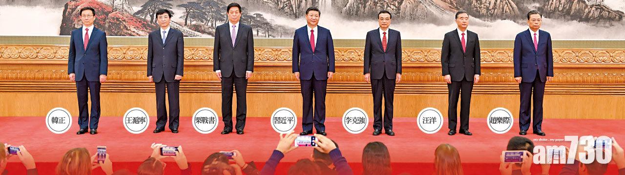 中共昨舉行第十九屆一中全會,會後連任總書記的習近平帶領當選的中央政治局常委亮相,依次為國務院總理李克強、中央辦公廳主任栗戰書、國務院副總理汪洋、已獲任中央書記處書記的中央政策研究室主任王滬寧、已獲任中紀委書記的中央組織部長趙樂際,以及上海市委書記韓正。外界預料,除連任的習近平及李克強職位不變,其餘政治局常委的排序已反映分工,栗戰書將任全國人大委員長、汪洋將任全國政協主席,韓正則料任國務院常務副總理。外媒普遍分析指,新一屆政治局常委均年逾60,習近平未按黨內「潛規則」選定接班人,或有意打破中共慣例,於5年後再留任。(相關新聞見A4)