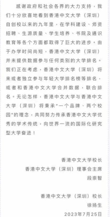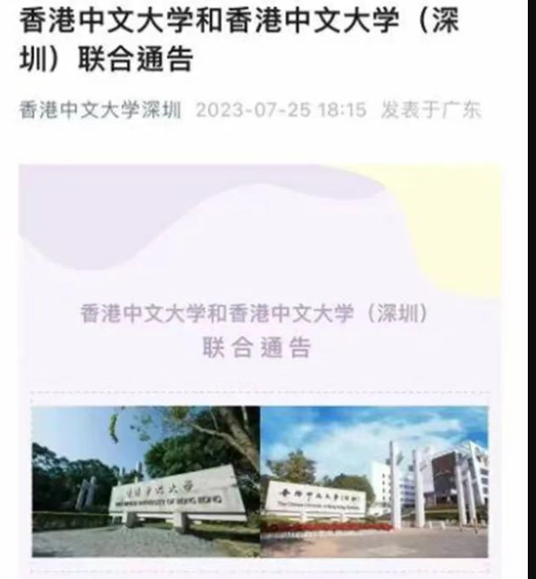 網上流傳通告顯示,一份題為「香港中文大學和香港中文大學(深圳)聯合通告」,由中大深圳分校在微信發出。內容指,中大深圳創校9年,在學科建設、師資招聘等各方面取得進步,但因辦學時間短暫,故未曾參與任何大學排名,又提及兩校正考慮將來或與香港中大「合併數據」、「聯合排名」等。