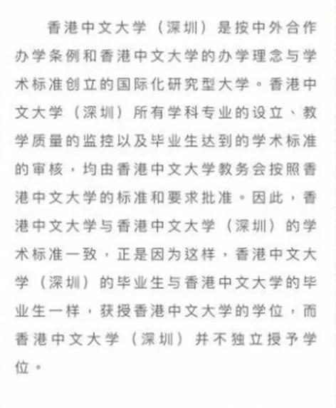 通告亦提及,香港中大與深圳分校學術標準一致,故深圳分校畢業生與香港中大生一樣獲授香港中大學位,深圳分校「並不獨立授予學位」,而通告現已在微信上被刪除。