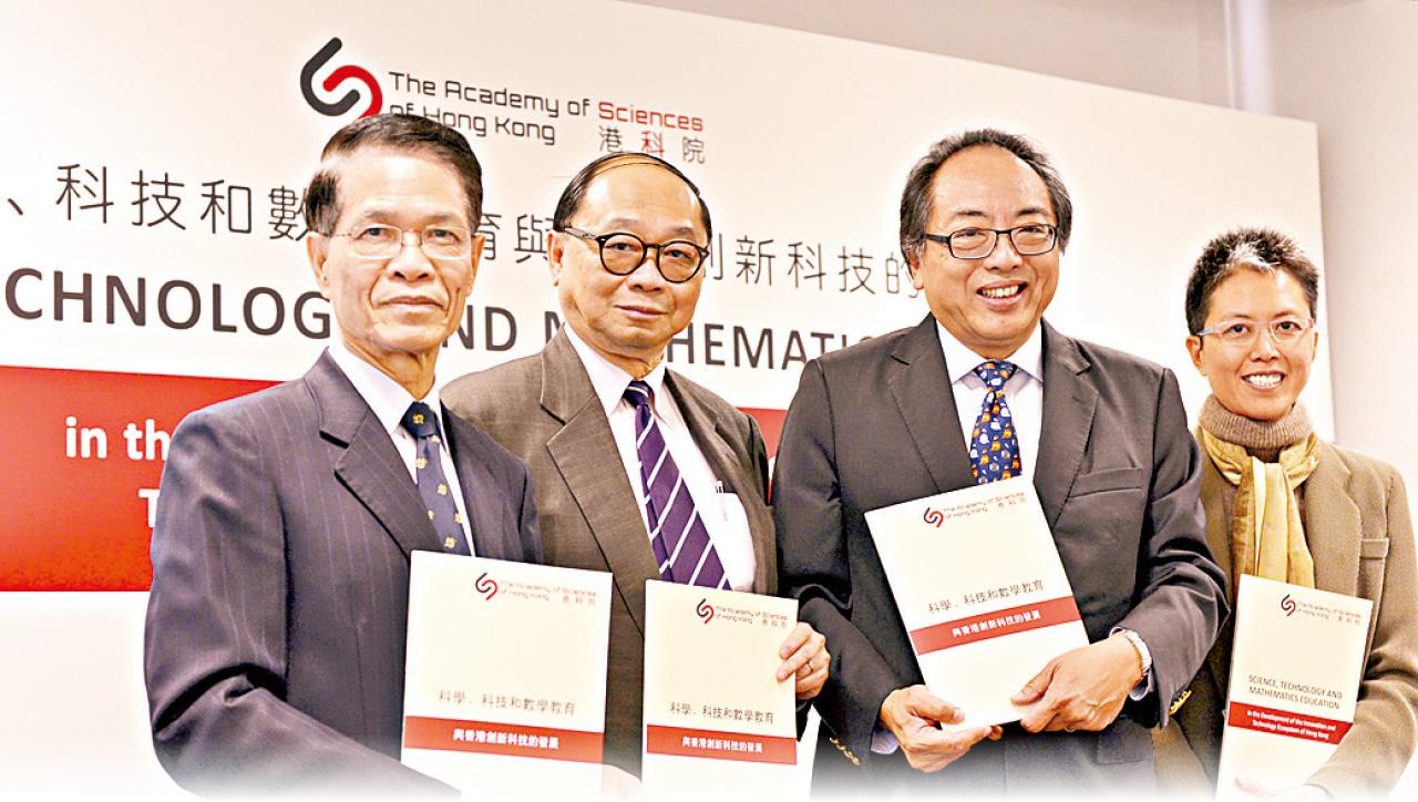 研究發現,本港高中課程側重4個核心科(中文、英文、數學及通識科),逾半受訪中學稱,至少花六成時間在此,較教育局建議的45%至55%課時比例更高。港科院創院院長徐立之(右二)建議調低核心科比重,以平衡科學與非科學教育。他又指,高等數學科亦應視作獨立科目,可考慮將科目分3類,為本身修讀文科、理科及商科的學生而設。而科學科目亦可參考現時英文科分甲、乙兩卷的做法,設有基礎和進階課程,供不同程度的學生選擇。