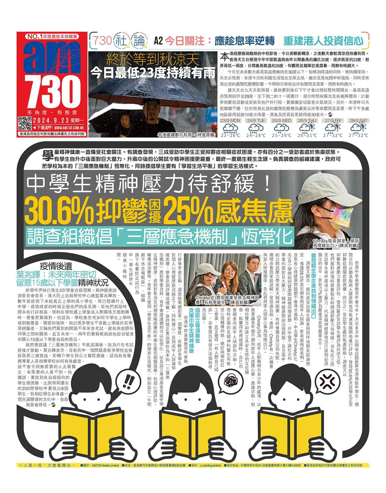 學童精神健康一直備受社會關注。有調查發現,三成受訪中學生正受抑鬱症相關症狀困擾,亦有四分之一受訪者處於焦慮狀態。有學生自升中後面對巨大壓力,升高中後的公開試令精神困擾更嚴重,最終一度萌生輕生念頭。負責調查的組織建議,政府可把學校為本的「三層應急機制」恆常化,同時提倡學生要有「學習生活平衡」的學習生活模式。
