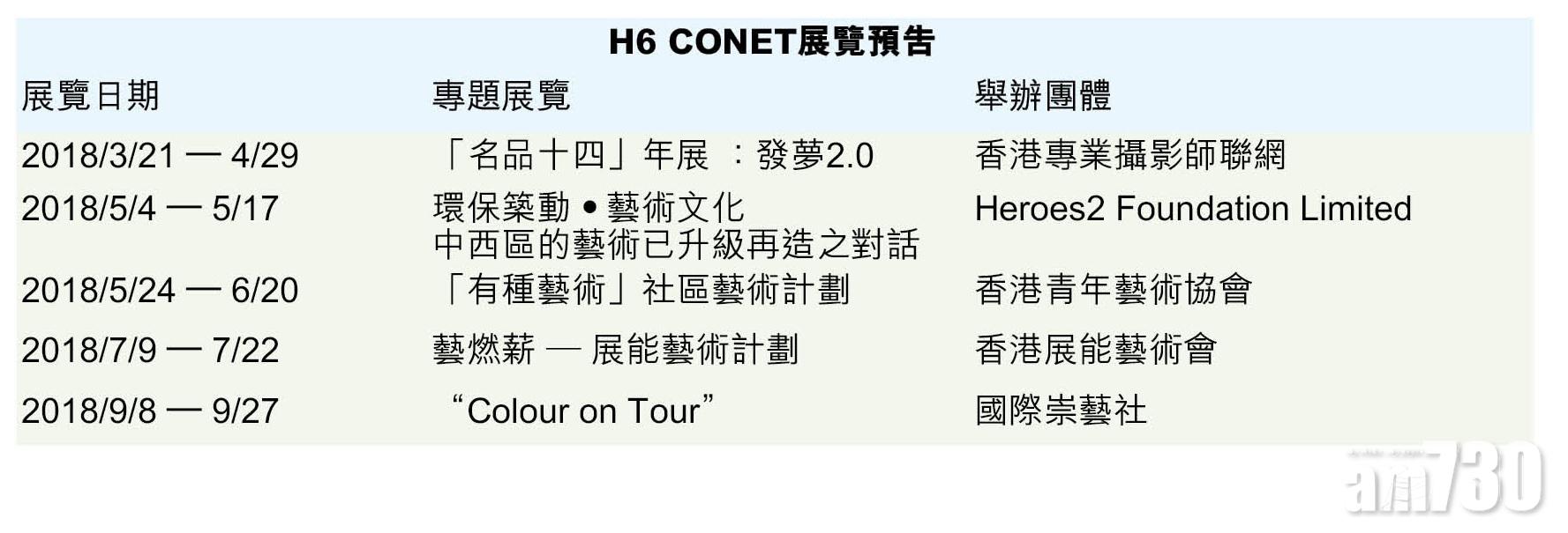 「愛連心基金」創辦人梁倩亙表示:「在中環很難找到場地展示社區藝術,而H6 CONET位處中環心臟地帶,加上空間的開放時間長,方便市民、附近的上班一族前來參觀。因此我們特別挑選富有中西區主題特色的作品,如渡海小輪、電車、維港煙花等展出,讓市民有機會深入了解更多中西區的歷史文化,亦與H6 CONET空間的使命互相呼應。」