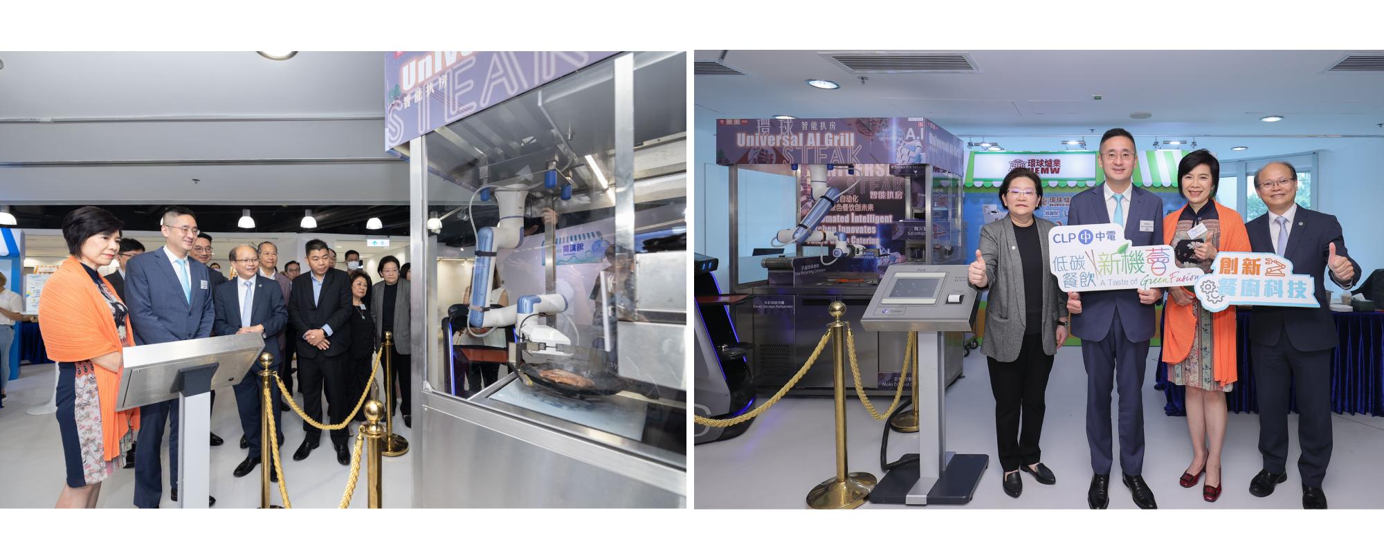 左圖:商務及經濟發展局副局長陳百里(左2)與中華電力管理層及在場嘉賓參觀智能燒牛扒系統。 右圖:商務及經濟發展局副局長陳百里(左2) 、中華電力企業發展總裁莊偉茵(右2)、中華電力客戶成功及體驗高級總監劉麗娜(左1)以及中華電力客戶成功及銷售總監盧志華博士(右1)於展覽檔位合照。