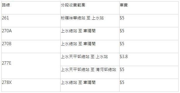 北區短途分段收費計劃的五條路綫及分段車費: