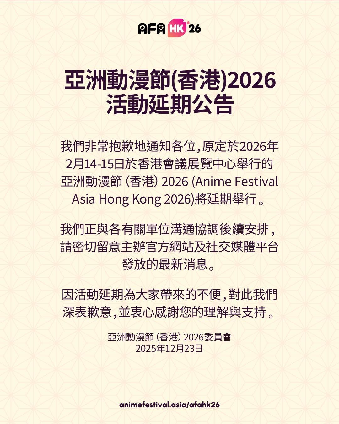 亞洲動漫節(香港)主辦方今日(26日)突在社交平台宣布活動延期舉行,未有透露原因。早前,新加坡主辦方SOZO宣布,停辦多年的「C3AFAHK」將以「Anime Festival Asia Hong Kong(AFAHK26)」名義,於2026年2月14至15日重臨香港,在會展中心舉行,「為本地及國際動漫愛好者帶來日本流行文化體驗」。