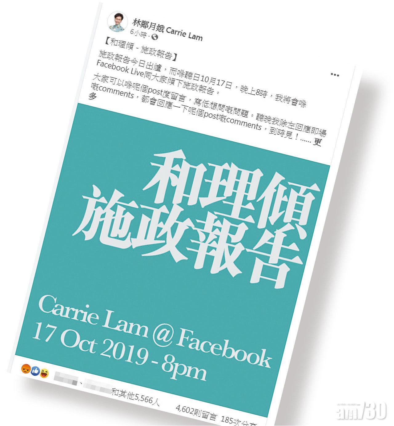 返回 本地 出版:2019-Oct-17 05:00 更新:2019-Oct-17 05:00 今晚FB開live 與網民「和理傾」 分享: 政府早前宣布今年取消施政報告電視及電台論壇,特首林鄭月娥昨午在Facebook專頁發帖,預告今晚8時在Facebook開live,舉行「和理傾施政報告」(圖),呼籲網民留言提出問題,她會即場回應,並在hashtag加上「對話總比對立好」字句。帖文上載3小時,有逾3千個留言,不少都是「五大訴求 缺一不可」,亦有網民留言「支持香港警察,無言感激」。 ADVERTISEMENT