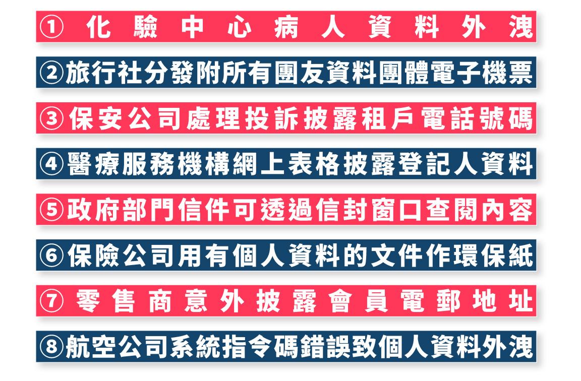 私隱專員公署昨公布8宗有關洩露個人資料事故,涉及醫療、保安、旅遊、保險、零售、航空及政府部門;如有零售商向會員寄發優惠訊息電郵時披露逾1,000名會員的電郵地址;航空公司的會員帳戶系統使用錯誤指令碼,令一名會員登入帳戶時,被錯誤連結至另一會員的帳戶,查閱到對方的個人資料。