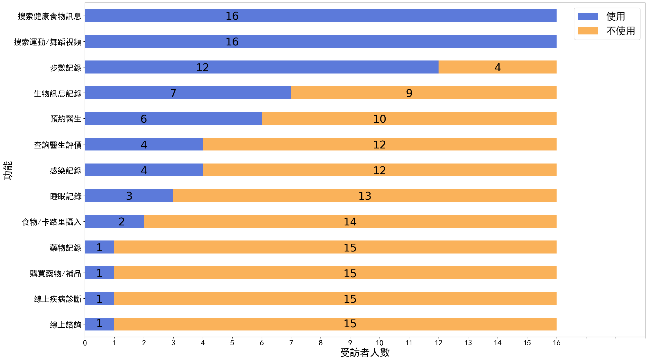 調查發現基層市民很少使用手機程式管理健康,不願意選用付費健康應用程式。有使用健康科技的受訪者中,大多數經常使用網站搜索健康食物及運動訊息和記錄每日步數,偶爾追蹤睡眠模式、水分攝入量和卡路里消耗。很少受訪者記錄其他生物指標,如血壓、血糖等。使用應用程式進行醫療診斷、購買藥物、診症的受訪者寥寥無幾。