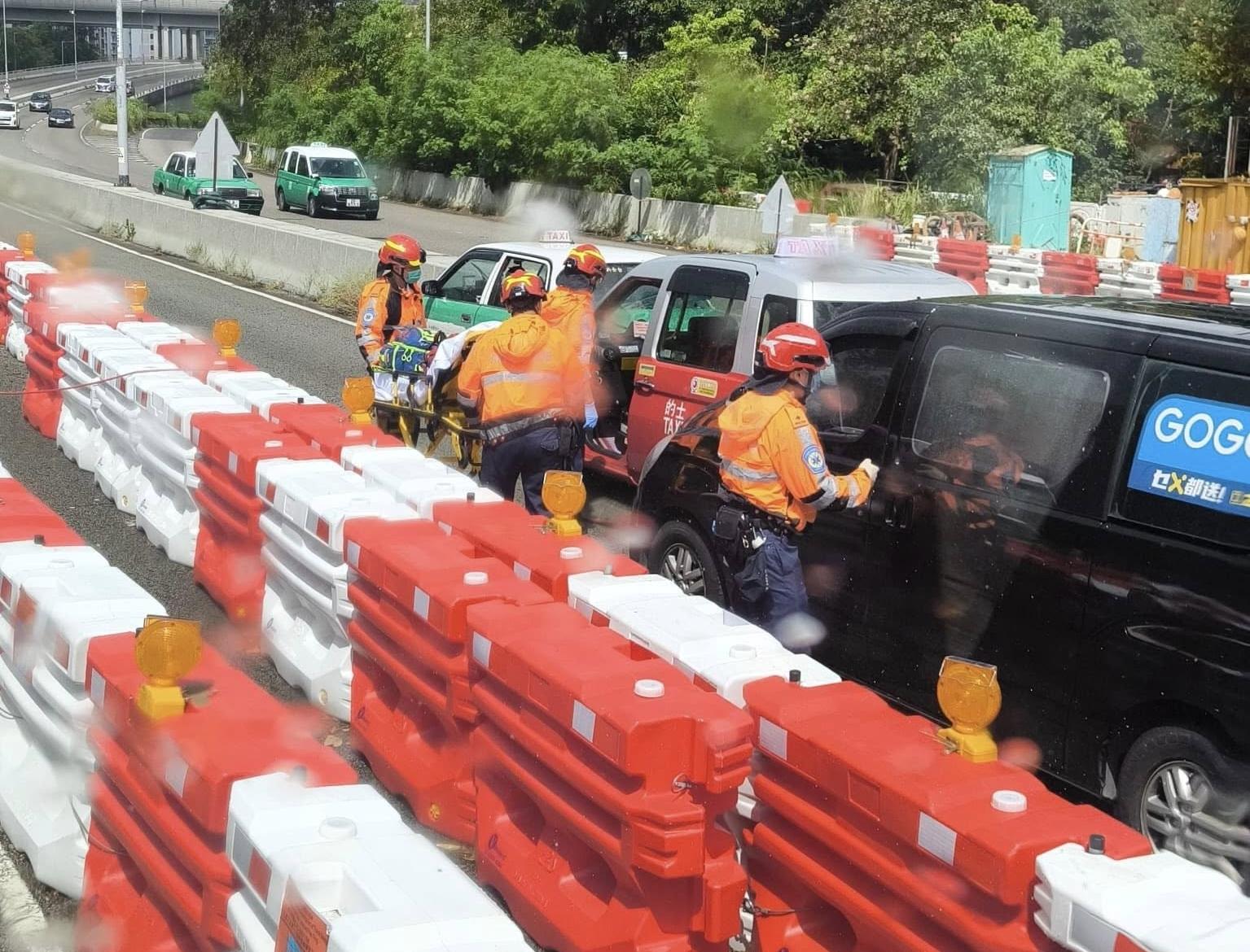 今日(13日)早上11時27分,元朗朗天路往天水圍方向有3輛車相撞,涉及兩輛的士及一輛車身印有「GOGO VAN」的客貨車,其中一輛市區的士被夾在中間。警方和救援人員接報後趕至現場,被夾在中間的的士司機報稱頸痛,救護員即場為他治理。警方正在調查事件。