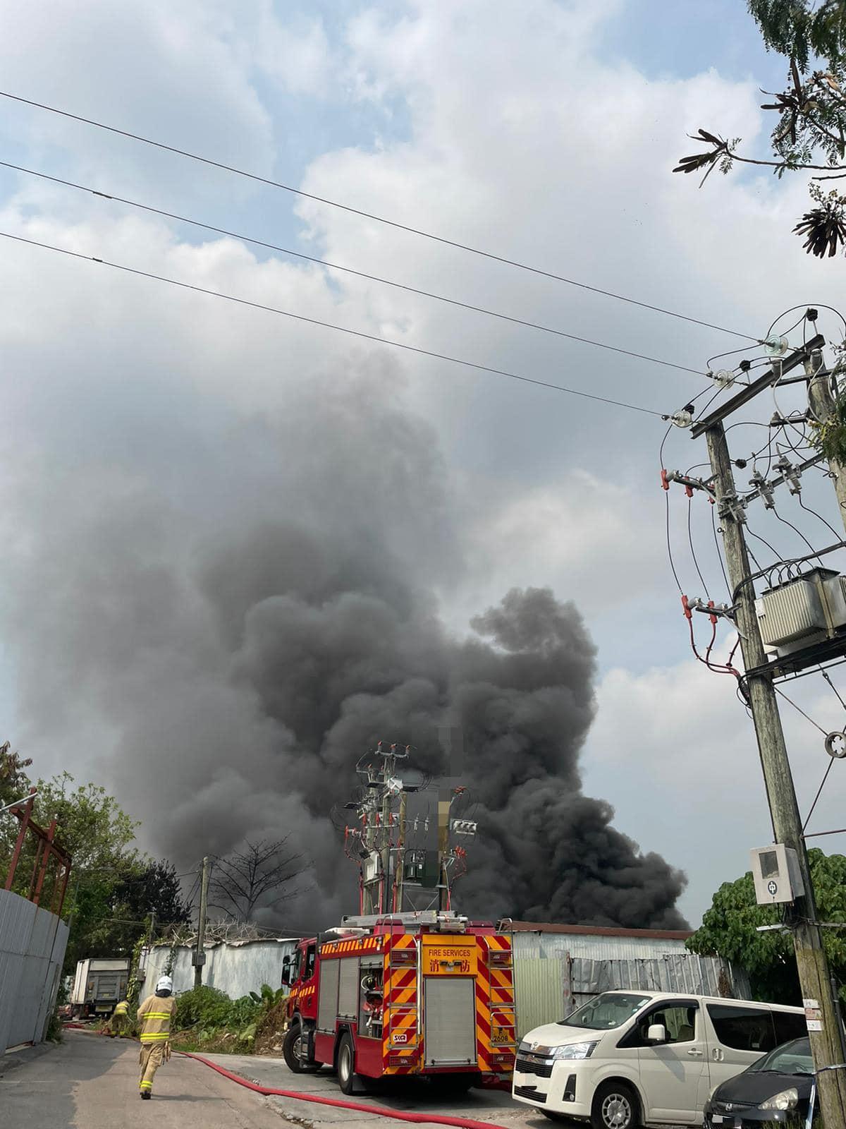 元朗貨倉起火濃煙密佈,消防籲關窗保持鎮定。(香港消防處@FB)