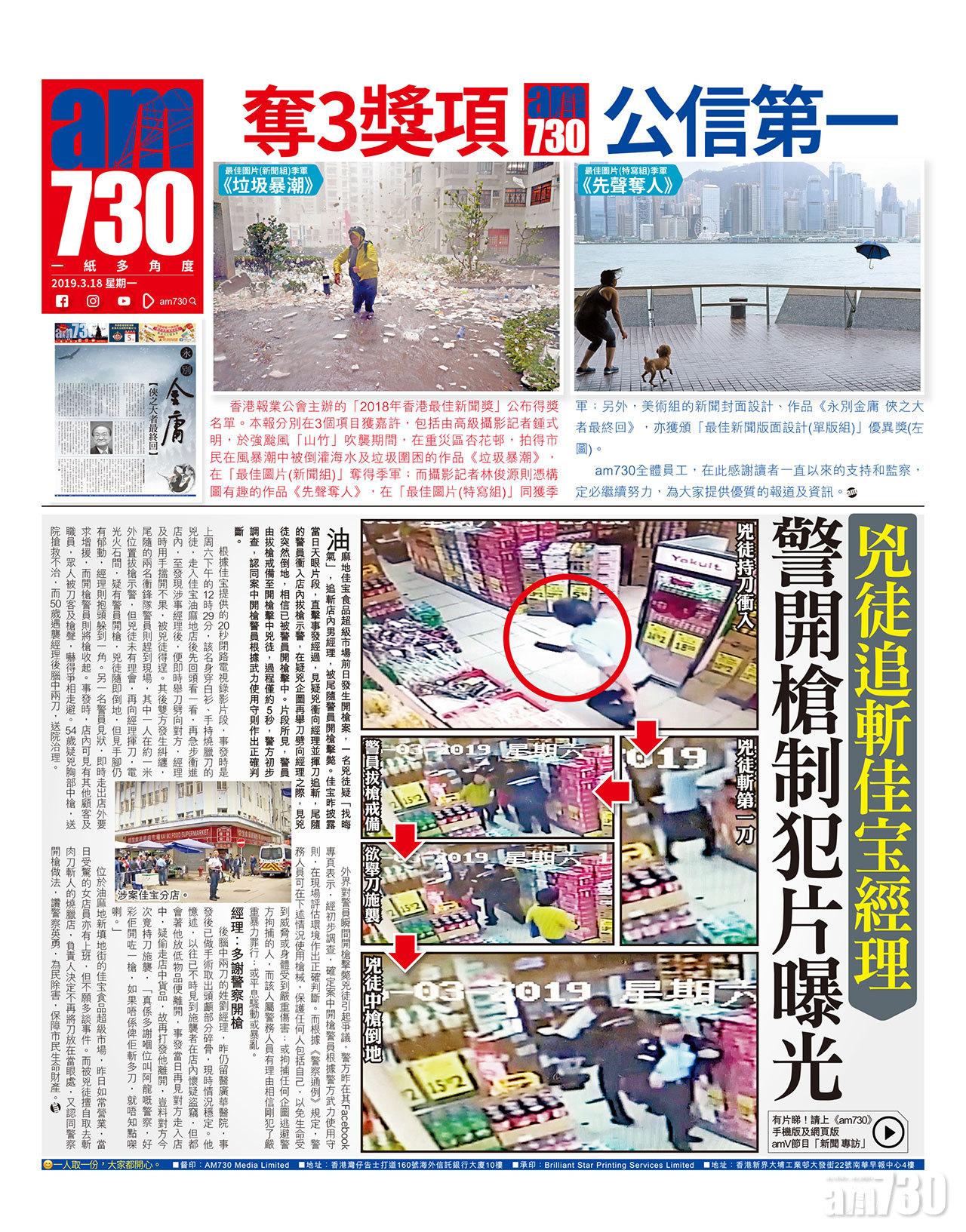 油麻地佳宝食品超級市場前日發生開槍案,一名兇徒疑「找晦氣」,追斬店內男經理,被尾隨警員開槍擊斃。佳宝昨披露當日天眼片段,直擊事發經過,見疑兇衝向經理並揮刀追斬,尾隨的警員衝入店內拔槍示警,在疑兇企圖再舉刀劈向經理之際,見兇徒突然倒地,相信已被警員開槍擊中。片段所見,警員由拔槍戒備至開槍擊中兇徒,過程僅約5秒,警方初步調查,認同案中開槍警員根據武力使用守則作出正確判斷。