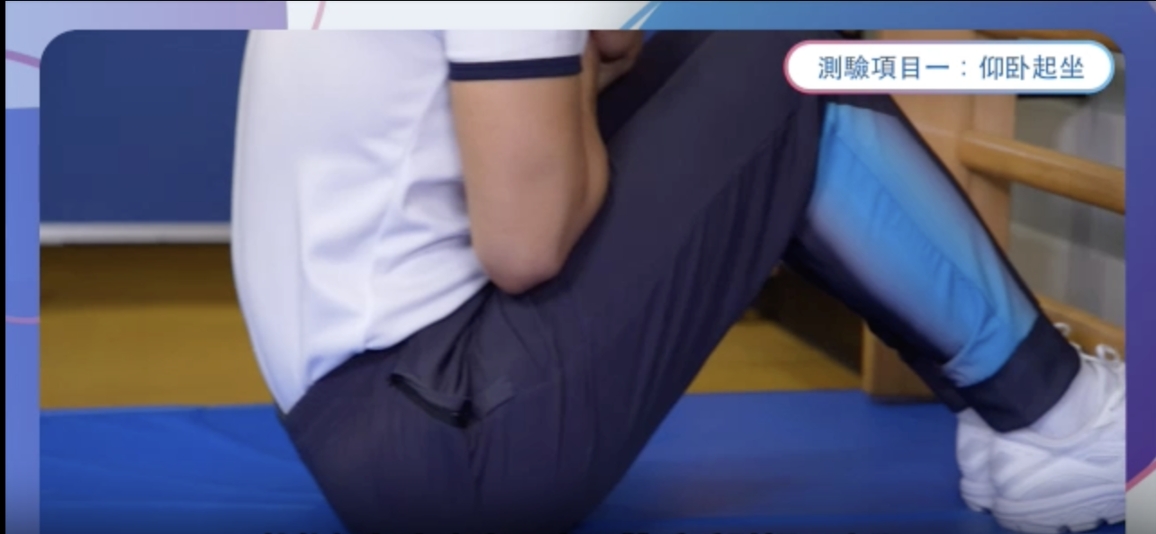 測試時限為一分鐘。開始前考生會臥在軟墊上,雙腳勾在木架的最下格。雙膝屈曲成90至120度,雙手交疊放在胸前,手指緊貼鎖骨,手肘緊貼身體。然後提起上半身,直到雙手手肘觸及大腿,再把身體下降至整塊肩胛骨觸到軟墊,方計計算為一次正確動作。考生要在一分鐘限時內,最少做到17次正確及完整動作才算一分,次數越多越高分。