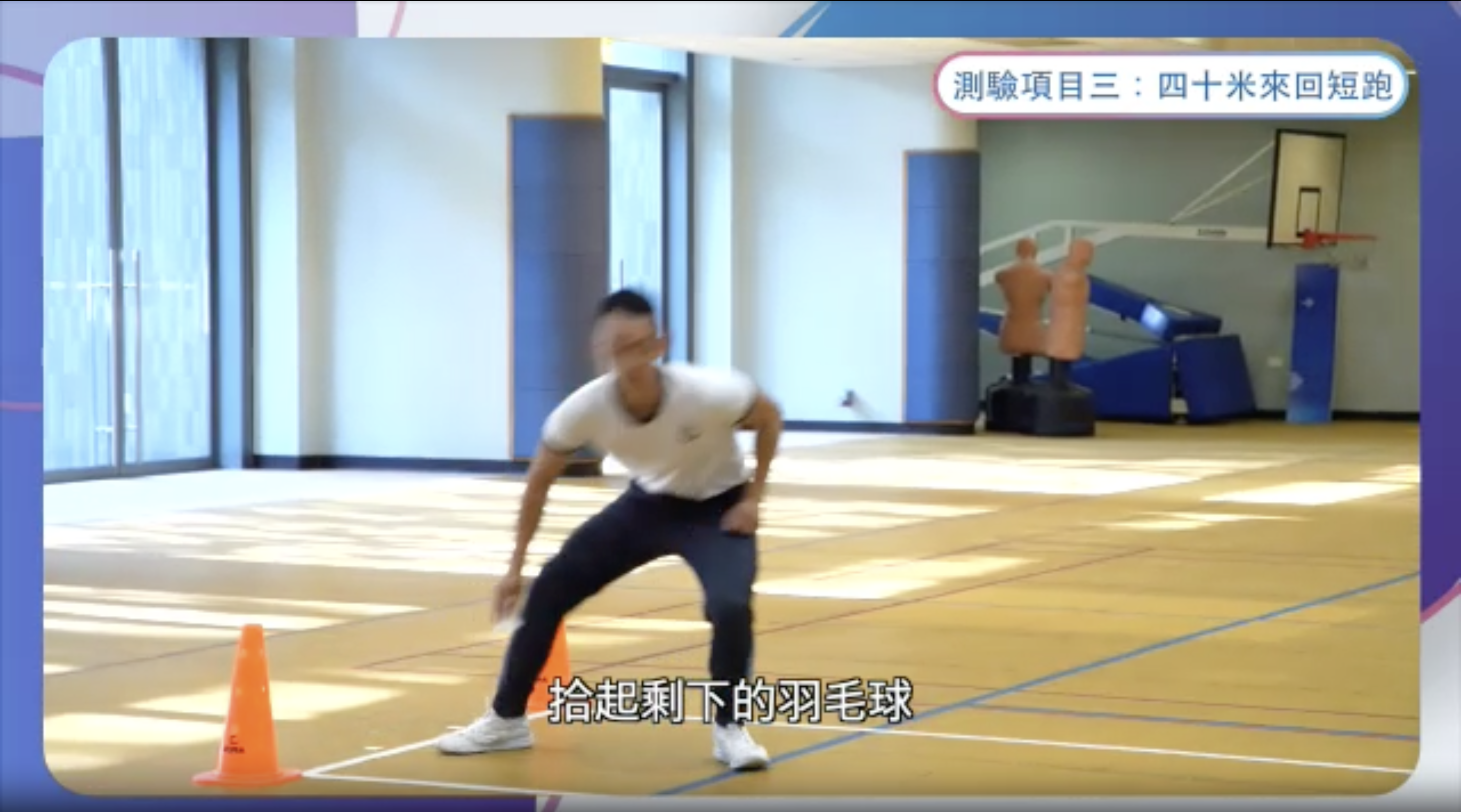 測試開始前,考生需站在起跑線後,聽到起跑指令時,考生要跑向對面的終點線,把終點線上的羽毛球拾起,再轉身跑回起跑線後放下羽毛球,然後再跑向終點線拾起剩下的羽毛球,最後跑回起跑線衝線。考生最慢要在12.3秒內完成,方計算為一分,成績以完成時間計算,跑得越快越高分。