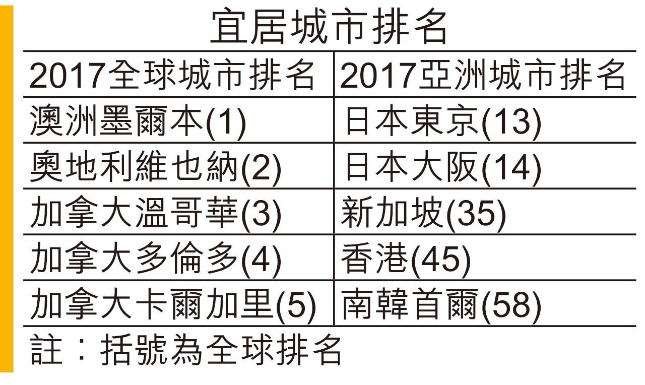 香港又被新加坡超越。英國經濟學人智庫(EIU)最新一期「全球宜居城市排名」顯示,澳洲墨爾本連續7年居榜首,新加坡首次超越香港,連升11級至第35位,香港排名則跌兩級至第45位,更是首次跌出亞洲三大排第四,低於日本東京、大阪和新加坡。調查機構指,新加坡教育制度持續改善,是排名急升的主因。