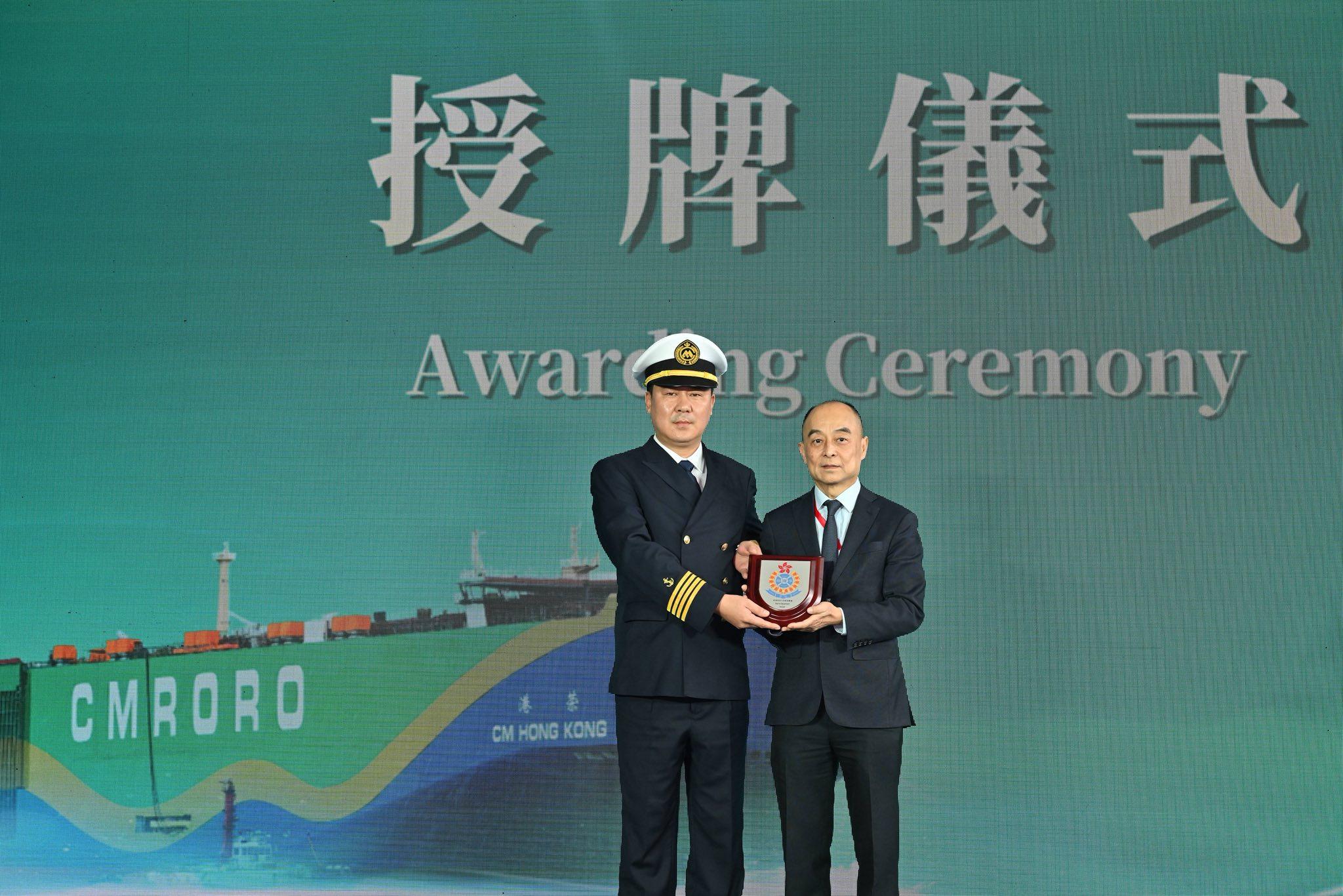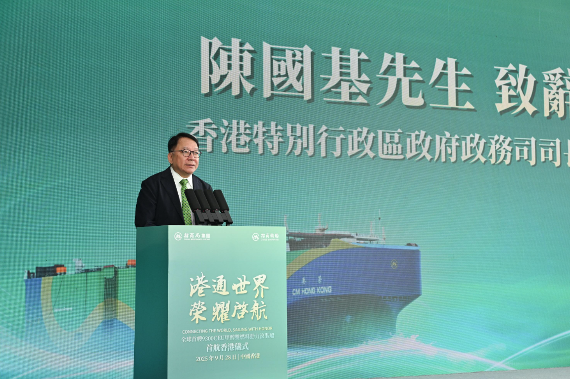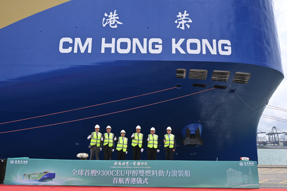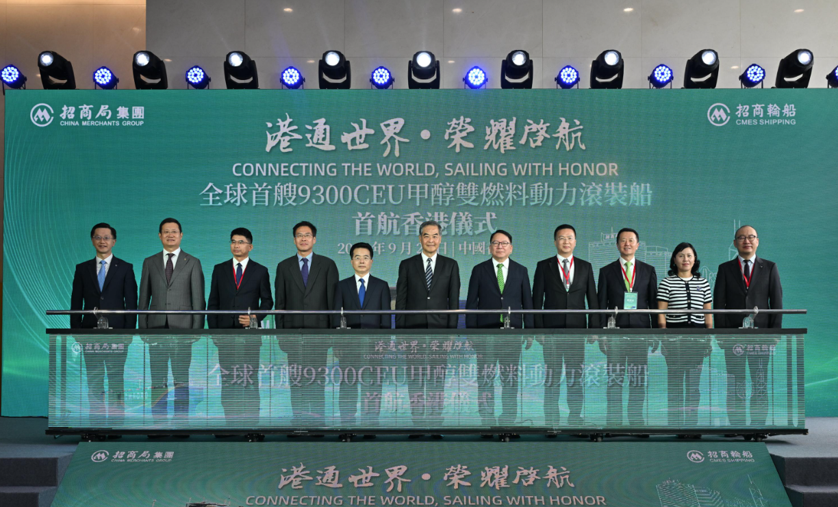 全球第一艘甲醇雙燃料動力滾裝船「港榮」輪首航。政務司長陳國基出席活動致辭表示,「港榮」以香港命名,懸掛香港特區區旗,以香港作為首航地點,對正在銳意發展綠色航運的香港,形容特別有意義。