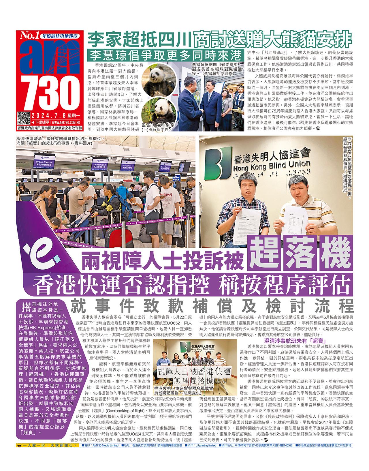 香港失明人協進會兩名「可獨立出行」的視障會員,5月22日原定乘搭下午3時由香港飛往日本東京的香港快運航班UO652,兩人憶述當日由辦理登機手續至禁區閘口登機時,地勤人員一直知悉他們為視障人士,其間一直獲得應有協助及順利獲發登機證,登機後機組人員更主動把他們調往航機較前位置就座,以及詳細解釋逃生程序和注意事項,兩人當時清楚表明可應付突發情況。
