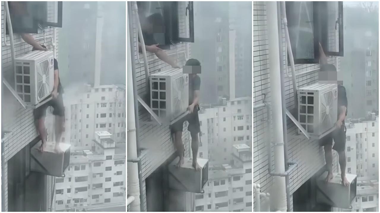 昨晚(24日)有網民上載一段影片,可見一名冷氣維修工疑似在樺加沙襲港打風期間,冒雨在高樓外牆維修。片長45秒,甫開始便見一名相信是維修冷氣的男子綁上安全帶危站在高層一單位外牆。他赤腳危站在下層的窗口式冷氣機頂部,屋內另有一名男子協助,該名赤腳男試圖將冷氣機散熱器移回承托架。