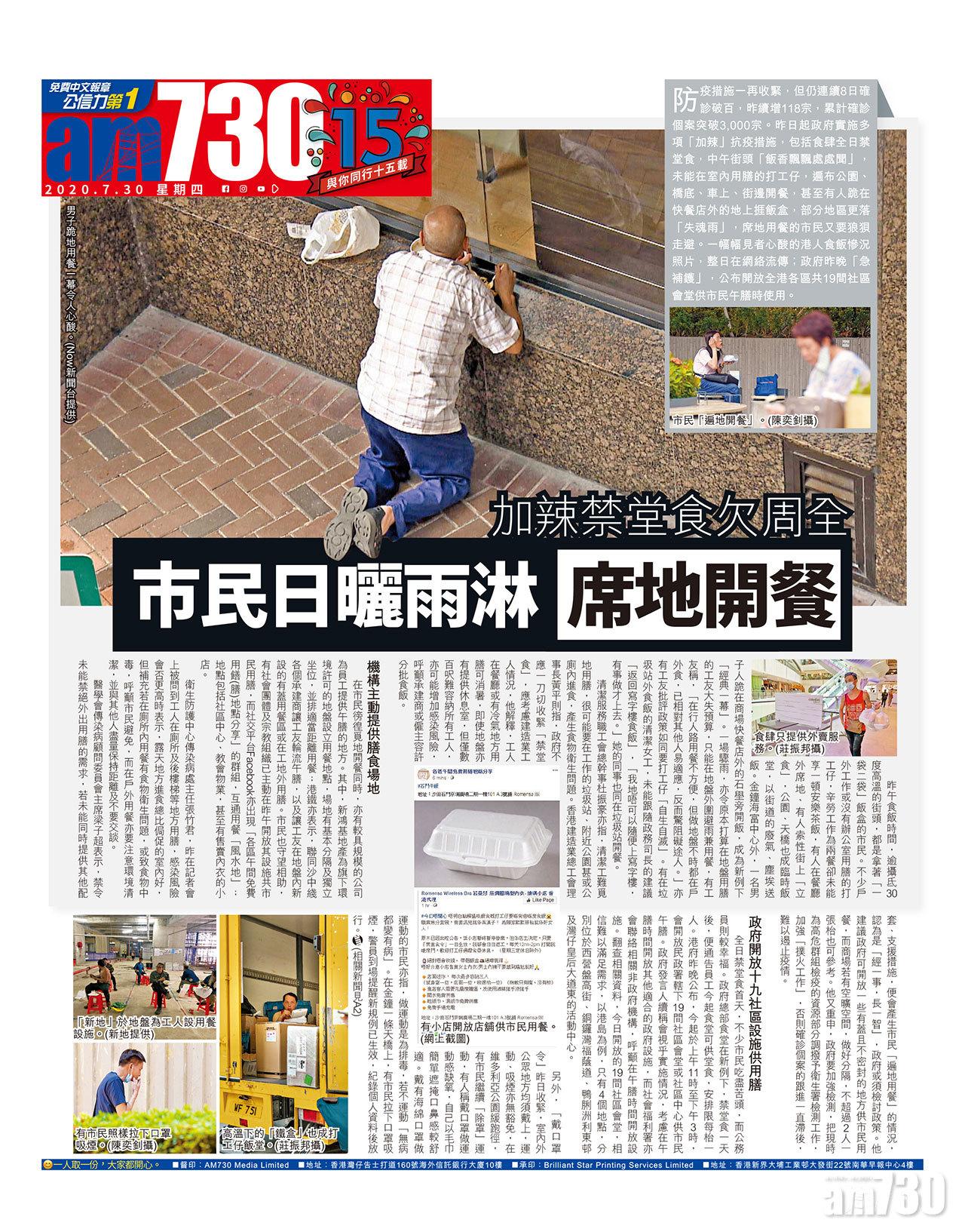 防疫措施一再收緊,但仍連續8日確診破百,昨續增118宗,累計確診個案突破3,000宗。昨日起政府實施多項「加辣」抗疫措施,包括食肆全日禁堂食,中午街頭「飯香飄飄處處聞」,未能在室內用膳的打工仔,遍布公園、橋底、車上、街邊開餐,甚至有人跪在快餐店外的地上捱飯盒,部分地區更落「失魂雨」,席地用餐的市民又要狼狽走避。一幅幅見者心酸的港人食飯慘況照片,整日在網絡流傳;政府昨晚「急補鑊」,公布開放全港各區共19間社區會堂供市民午膳時使用。