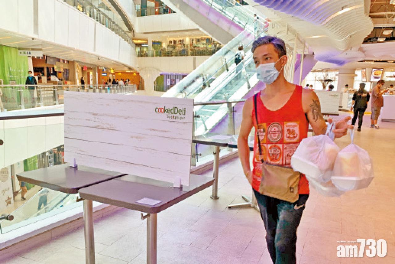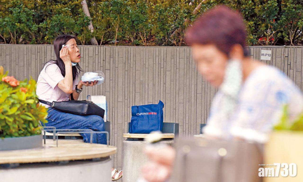昨午食飯時間,逾攝氐30度高溫的街頭,都是拿著「一袋二袋」飯盒的市民。不少戶外工作或沒有辦公室用膳的打工仔,辛勞工作為兩餐卻未能享一頓安樂茶飯,有人在餐廳外席地、有人索性街上「立食」,公園、天橋也成臨時飯堂,以街道的廢氣、塵埃送飯。金鐘海富中心外,一名男子人跪在商場快餐店外的石壆旁開飯,成為新例下「經典一幕」。一場驟雨,亦令原本打算在地盤用膳的工友大失預算,只能在地盤外圍避雨兼用餐,有工友稱,「在行人路用餐不方便,但做地盤不時都在戶外食,已相對其他人易適應,反而驚阻礙途人。」亦有工友批評政策如同要打工仔「自生自滅」。有在垃圾站外食飯的清潔女工,未能跟隨政務司長的建議「返回寫字樓食飯」,「我地唔可以隨便上寫字樓,有事做才上去。」她的同事也同在垃圾站開餐。